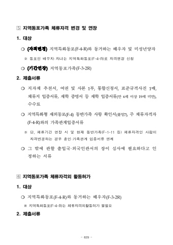 - 629 -%uf000%uc9c0%uc5ed%ub3d9%ud3ec%uac00%uc871 %uccb4%ub958%uc790%uaca9 %ubcc0%uacbd %ubc0f %uc5f0%uc7a51. %ub300%uc0c1%u274d (%uc790%uaca9%ubcc0%uacbd)%uc9c0%uc5ed%ud2b9%ud654%ub3d9%ud3ec(F-4-R)%uc640 %ub3d9%uac70%ud558%ub294 %ubc30%uc6b0%uc790 %ubc0f %ubbf8%uc131%ub144%uc591%uc790%u203b%ub3d9%ud3ec%uc778%ubc30%uc6b0%uc790%u2027%uc790%ub140%ub294%uc9c0%uc5ed%ud2b9%ud654%ub3d9%ud3ec(F-4-R)%ub85c%uc790%uaca9%ubcc0%uacbd%uc2e0%uccad%u274d (%uae30%uac04%uc5f0%uc7a5)%uc9c0%uc5ed%ub3d9%ud3ec%uac00%uc871(F-3-2R)2. %uc81c%ucd9c%uc11c%ub958%u274d %uc9c0%uc790%uccb4 %ucd94%ucc9c%uc11c,%uc5ec%uad8c %ubc0f %uc0ac%ubcf8 1%ubd80,%ud1b5%ud569%uc2e0%uccad%uc11c,%ud45c%uc900%uaddc%uaca9%uc0ac%uc9c4 1%ub9e4,%uccb4%ub958%uc9c0 %uc785%uc99d%uc11c%ub958,%uc7ac%ud559 %uc99d%uba85%uc11c %ub4f1 %uc7ac%ud559 %uc785%uc99d%uc11c%ub958(%ub9cc 6%uc138 %uc774%uc0c1 19%uc138 %ubbf8%ub9cc),%uc218%uc218%ub8cc%u274d %uc9c0%uc5ed%ud2b9%ud654%ud615 %uc7ac%uc678%ub3d9%ud3ec(F-4)%ub3d9%ubc18%uac00%uc871 %uc0ac%ud56d%ud655%uc778%uc11c(%ubd99%uc7847),%uc8fc %uccb4%ub958%uc790%uaca9%uc790(F-4-R)%uc640%uc758 %uac00%uc871%uad00%uacc4%uc785%uc99d%uc11c%ub958%u203b%ub2e8,%uccb4%ub958%uae30%uac04%uc5f0%uc7a5%uc2dc%ubc0f%ud604%uc7ac%ub3d9%ubc18%uac00%uc871(F-1-11%ub4f1)%uccb4%ub958%uc790%uaca9%uc778%uc0ac%ub78c%uc774%uc790%uaca9%ubcc0%uacbd%ud558%ub294%uacbd%uc6b0%ud63c%uc778%u00b7%uac00%uc871%uad00%uacc4%uc785%uc99d%uc11c%ub958%uba74%uc81c%u274d %uadf8 %ubc16%uc5d0 %uad00%ud560 %ucd9c%uc785%uad6d%u00b7%uc678%uad6d%uc778%uad00%uc11c%uc758 %uc7a5%uc774 %uc2ec%uc0ac%uc5d0 %ud544%uc694%ud558%ub2e4%uace0 %uc778%uc815%ud558%ub294 %uc11c%ub958%uf000%uc9c0%uc5ed%ub3d9%ud3ec%uac00%uc871 %uccb4%ub958%uc790%uaca9%uc678 %ud65c%ub3d9%ud5c8%uac001. %ub300%uc0c1%u274d %uc9c0%uc5ed%ud2b9%ud654%ub3d9%ud3ec(F-4-R)%uc640 %ub3d9%uac70%ud558%ub294 %ubc30%uc6b0%uc790(F-3-2R)%u203b%uc9c0%uc5ed%ud2b9%ud654%ub3d9%ud3ec(F-4-R)%ub294%uccb4%ub958%uc790%uaca9%uc678%ud65c%ub3d9%ud5c8%uac00%ubd88%ud544%uc6942. %uc81c%ucd9c%uc11c%ub958