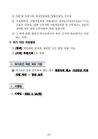 - 630 -%u274d %uc5ec%uad8c %ubc0f %uc0ac%ubcf8 1%ubd80,%uc678%uad6d%uc778%ub4f1%ub85d%uc99d,%ud1b5%ud569%uc2e0%uccad%uc11c,%uc218%uc218%ub8cc%u274d %uace0%uc6a9%uacc4%uc57d%uc11c,%uc0ac%uc5c5%uc790%ub4f1%ub85d%uc99d %uc0ac%ubcf8(%ubc95%uc778%uc740 %ubc95%uc778%ub4f1%uae30%uc0ac%ud56d%uc804%ubd80%uc99d%uba85%uc11c %ucd94%uac00),%uace0%uc6a9%uc8fc%uc2e0%ubd84%uc99d,%uc2e4%uc81c%uadfc%ubb34%uc9c0%uc640 %uc0ac%uc5c5%uc790%ub4f1%ub85d%uc99d %uc0c1 %uadfc%ubb34%uc9c0(%uc8fc%uc18c %ud3ec%ud568)%uac00 %uc0c1%uc774%ud55c %uacbd%uc6b0%uc2e4%uc81c %uadfc%ubb34%uc9c0%uc640%uc758 %uad00%uacc4 %uc785%uc99d%uc11c%ub958 %u274d %uadf8 %ubc16%uc5d0 %uad00%ud560 %ucd9c%uc785%uad6d%u00b7%uc678%uad6d%uc778%uad00%uc11c%uc758 %uc7a5%uc774 %uc2ec%uc0ac%uc5d0 %ud544%uc694%ud558%ub2e4%uace0 %uc778%uc815%ud558%ub294 %uc11c%ub9583. %ud5c8%uac00 %ub300%uc0c1 %ucde8%uc5c5%ud65c%ub3d9%u274d(%ubc94%uc704)%ucde8%uc5c5%uc81c%ud55c %ubd84%uc57c%ub97c %uc81c%uc678%ud55c %ubaa8%ub4e0 %ud65c%ub3d9 %ud5c8%uc6a9 %uac00%ub2a5%u274d (%uc9c0%uc5ed)%ucd94%ucc9c%uc9c0%uc5ed%uc73c%ub85c %uc81c%ud55c%u2163. %ud5c8%uac00%uc870%uac74 %uc704%ubc18 %ucc98%ub9ac %uae30%uc900%u274d %ud5c8%uac00%uc870%uac74 %ub4f1%uc744%uc900%uc218%ud558%uc9c0 %uc54a%ub294 %uacbd%uc6b0 %uccb4%ub958%uc790%uaca9 %ucde8%uc18c,%uae30%uac04%uc5f0%uc7a5%uc5b5%uc81c%uc0ac%ubc94 %ucc98%ub9ac%ub4f1 %uc5c4%uc911 %uc870%uce58%u2164. %uc2dc%ud589%uc77c%u274d %uc2dc%ud589%uc77c :2025.2.24.(%uc6d4)