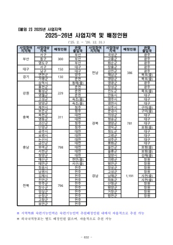 - 632 -%u3010%ubd99%uc784 2%u30112025%ub144 %uc0ac%uc5c5%uc9c0%uc5ed2025~26%ub144 %uc0ac%uc5c5%uc9c0%uc5ed %ubc0f %ubc30%uc815%uc778%uc6d0(%u201825. 2. ~ %u201926. 12. 31.)%u203b %uc9c0%uc5ed%ud2b9%ud654 %uc219%ub828%uae30%ub2a5%uc778%ub825%uc740 %uc219%ub828%uae30%ub2a5%uc778%ub825 %ucd94%ucc9c%ubc30%uc815%uc778%uc6d0 %ub0b4%uc5d0%uc11c %uc790%uc728%uc801%uc73c%ub85c %ucd94%ucc9c %uac00%ub2a5%u203b %uc678%uad6d%uad6d%uc801%ub3d9%ud3ec%ub294 %ubcc4%ub3c4 %ubc30%uc815%uc778%uc6d0 %uc5c6%uc73c%uba70, %uc790%uc728%uc801%uc73c%ub85c %ucd94%ucc9c %uac00%ub2a5%uc0ac%uc5c5%ucc38%uc5ec%uc9c0%uc790%uccb4%uc0ac%uc5c5%ub300%uc0c1%uc9c0%uc5ed%ubc30%uc815%uc778%uc6d0%uad00%ud560%ucd9c%uc785%uad6d%uc0ac%uc5c5%ucc38%uc5ec%uc9c0%uc790%uccb4%uc0ac%uc5c5%ub300%uc0c1%uc9c0%uc5ed%ubc30%uc815%uc778%uc6d0%uad00%ud560%ucd9c%uc785%uad6d%ubd80%uc0b0%uc11c%uad6c300%ubd80%uc0b0%uc804%ub0a8%uace1%uc131%uad70386%uad11%uc8fc%ub3d9%uad6c%ubd80%uc0b0%uace0%ud765%uad70%uad11%uc8fc%uc601%ub3c4%uad6c%ubd80%uc0b0%ud654%uc21c%uad70%uad11%uc8fc%ub300%uad6c%uc11c%uad6c150%ub300%uad6c%uc7a5%ud765%uad70%uad11%uc8fc%ub0a8%uad6c%ub300%uad6c%uac15%uc9c4%uad70%uad11%uc8fc%uacbd%uae30%uc5f0%ucc9c%uad70130%uc591%uc8fc%ud574%ub0a8%uad70%ubaa9%ud3ec(%ucd9c)%uac00%ud3c9%uad70%ucd98%ucc9c%uc601%uc554%uad70%ubaa9%ud3ec(%ucd9c)%uac15%uc6d0%uc0bc%ucc99%uc2dc229%ub3d9%ud574(%ucd9c)%uc601%uad11%uad70%uad11%uc8fc%ud64d%ucc9c%uad70%ucd98%ucc9c%uc7a5%uc131%uad70%uad11%uc8fc%ud6a1%uc131%uad70%ucd98%ucc9c%uc9c4%ub3c4%uad70%ubaa9%ud3ec(%ucd9c)%uc601%uc6d4%uad70%ucd98%ucc9c%uacbd%ubd81%uc548%ub3d9%uc2dc781%ub300%uad6c%uace0%uc131%uad70%uc18d%ucd08(%ucd9c)%uc601%uc8fc%uc2dc%ub300%uad6c%uc591%uc591%uad70%uc18d%ucd08(%ucd9c)%uc601%ucc9c%uc2dc%ub300%uad6c%ucda9%ubd81%uc81c%ucc9c%uc2dc311%uccad%uc8fc%uc0c1%uc8fc%uc2dc%uad6c%ubbf8(%ucd9c)%ubcf4%uc740%uad70%uccad%uc8fc%ubb38%uacbd%uc2dc%uad6c%ubbf8(%ucd9c)%uc625%ucc9c%uad70%ub300%uc804%uc758%uc131%uad70%ub300%uad6c%uc601%ub3d9%uad70%ub300%uc804%uccad%uc1a1%uad70%ub300%uad6c%uad34%uc0b0%uad70%uccad%uc8fc%uc601%uc591%uad70%ub300%uad6c%ub2e8%uc591%uad70%uccad%uc8fc%uc601%ub355%uad70%ud3ec%ud56d(%ucd9c)%ucda9%ub0a8%uacf5%uc8fc%uc2dc798%ub300%uc804%uccad%ub3c4%uad70%ub300%uad6c%ubcf4%ub839%uc2dc%ub300%uc804%uace0%ub839%uad70%ub300%uad6c%ub17c%uc0b0%uc2dc%ub300%uc804%uc131%uc8fc%uad70%ub300%uad6c%uae08%uc0b0%uad70%ub300%uc804%ubd09%ud654%uad70%ub300%uad6c%ubd80%uc5ec%uad70%ub300%uc804%uc6b8%uc9c4%uad70%ud3ec%ud56d(%ucd9c)%uc11c%ucc9c%uad70%ub300%uc804%uc6b8%ub989%uad70%ud3ec%ud56d(%ucd9c)%uccad%uc591%uad70%ub300%uc804%uacbd%ub0a8%ubc00%uc591%uc2dc1,191%uae40%ud574(%ucd9c)%uc608%uc0b0%uad70%ucc9c%uc548(%ucd9c)%uc758%ub839%uad70%ucc3d%uc6d0%ud0dc%uc548%uad70%uc11c%uc0b0(%ucd9c)%ud568%uc548%uad70%ucc3d%uc6d0%uc804%ubd81%uc815%uc74d%uc2dc796%uc804%uc8fc%ucc3d%ub155%uad70%ucc3d%uc6d0%ub0a8%uc6d0%uc2dc%uc804%uc8fc%uace0%uc131%uad70%ucc3d%uc6d0%uae40%uc81c%uc2dc%uc804%uc8fc%ub0a8%ud574%uad70%uc0ac%ucc9c(%ucd9c)%uc9c4%uc548%uad70%uc804%uc8fc%ud558%ub3d9%uad70%uc0ac%ucc9c(%ucd9c)%ubb34%uc8fc%uad70%uc804%uc8fc%uc0b0%uccad%uad70%ucc3d%uc6d0%uc7a5%uc218%uad70%uc804%uc8fc%ud568%uc591%uad70%ucc3d%uc6d0%uc784%uc2e4%uad70%uc804%uc8fc%uac70%ucc3d%uad70%ucc3d%uc6d0%uc21c%ucc3d%uad70%uc804%uc8fc%ud569%ucc9c%uad70%ucc3d%uc6d0%uace0%ucc3d%uad70%uc804%uc8fc%ubd80%uc548%uad70%uc804%uc8fc