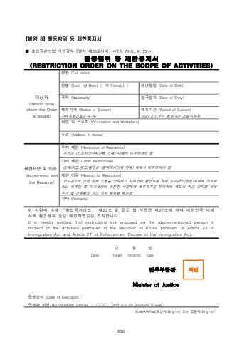 - 638 -%u3010%ubd99%uc784 8%u3011%ud65c%ub3d9%ubc94%uc704 %ub4f1 %uc81c%ud55c%ud1b5%uc9c0%uc11c%u25a0 %ucd9c%uc785%uad6d%uad00%ub9ac%ubc95 %uc2dc%ud589%uaddc%uce59 [%ubcc4%uc9c0 %uc81c39%ud638%uc11c%uc2dd] <%uac1c%uc815 2016. 9. 29.>%ud65c%ub3d9%ubc94%uc704%ub4f1%uc81c%ud55c%ud1b5%uc9c0%uc11c(RESTRICTIONORDERONTHESCOPEOFACTIVITIES)%ub300%uc0c1%uc790(Person upon whom the Order is issued)%uc131%uba85 (Full name)%uc131%ubcc4 (Sex)%ub0a8 Male[ ] %uc5ec Female[ ]%uc0dd%ub144%uc6d4%uc77c (Date of Birth)%uad6d%uc801 (Nationality)%uc785%uad6d%uc77c%uc790 (Date of Entry)%uccb4%ub958%uc790%uaca9 (Status of Sojourn)%uc9c0%uc5ed%ud2b9%ud654%ub3d9%ud3ec(F-4-R)%uccb4%ub958%uae30%uac04 (Period of Sojourn)2024.2.1.%ubd80%ud130 %uccb4%ub958%uae30%uac04 %uc885%ub8cc%uc2dc%uae4c%uc9c0%uc9c1%uc5c5 %ubc0f %uadfc%ubb34%ucc98 (Occupation and Workplace)%uc8fc%uc18c (Address in Korea)%uc81c%ud55c%uc0ac%ud56d %ubc0f %uc774%uc720(Restrictions andthe Reasons)%uc8fc%uac70 %uc81c%ud55c (Restriction of Residence)%uc8fc%uac70%ub294 (%uae30%ucd08%uc9c0%ubc29%uc790%uce58%ub2e8%uccb4 %uae30%uc7ac) %ub0b4%uc5d0%uc11c %uc774%ub8e8%uc5b4%uc838%uc57c %ud568 %uae30%ud0c0 %uc81c%ud55c (Other Restrictions)%uacbd%uc81c(%ucde8%uc5c5,%ucc3d%uc5c5)%ud65c%ub3d9%uc740 (%uad11%uc5ed%uc790%uce58%ub2e8%uccb4 %uae30%uc7ac) %ub0b4%uc5d0%uc11c %uc774%ub8e8%uc5b4%uc838%uc57c %ud568%uc81c%ud55c %uc774%uc720 (Reason for Restriction)%uc778%uad6c%uac10%uc18c%ub85c %uc778%ud55c %uc9c0%uc5ed %uc18c%uba78%uc744 %ubc29%uc9c0%ud558%uace0 %uc9c0%uc5ed%uacbd%uc81c %ud65c%uc131%ud654%ub97c %uc704%ud574 %uc778%uad6c%uac10%uc18c(%uad00%uc2ec)%uc9c0%uc5ed%uc5d0 %uac70%uc8fc%ud558%ub824%ub294 %uc678%uad6d%uc778 %uc911 %uc9c0%uc790%uccb4%uc7a5%uc774 %ucd94%ucc9c%ud55c %uc0ac%ub78c%uc5d0%uac8c %uccb4%ub958%uc790%uaca9%uc744 %ubd80%uc5ec%ud558%ub418 %uc81c%ub3c4%uc758 %uc545%uc6a9 %ubc29%uc9c0%ub97c %uc704%ud574 %uc8fc%uac70 %ubc0f %uacbd%uc81c%ud65c%ub3d9 %uac00%ub2a5 %uc9c0%uc5ed %ubc94%uc704%ub97c %uc81c%ud55c%ud568%uae30%ud0c0 (Remarks)%uc704 %uc0ac%ub78c%uc5d0 %ub300%ud574 %u300c%ucd9c%uc785%uad6d%uad00%ub9ac%ubc95%u300d %uc81c22%uc870 %ubc0f %uac19%uc740 %ubc95 %uc2dc%ud589%ub839 %uc81c27%uc870%uc5d0 %ub530%ub77c %ub300%ud55c%ubbfc%uad6d %ub0b4%uc5d0%uc11c%uc758%ud65c%ub3d9%ubc94%uc704 %ub4f1%uc744 %uc81c%ud55c%ud558%uc600%uc74c%uc744 %ud1b5%uc9c0%ud569%ub2c8%ub2e4.It is hereby notified that restrictions are imposed on the abovementioned person in respect of the activities permitted in the Republic of Korea pursuant to Article 22 of Immigration Act and Article 27 of Enforcement Decree of the Immigration Act.%ub144 %uc6d4 %uc77cDate (year) (month) (day)%ubc95%ubb34%ubd80%uc7a5%uad00%uc9c1%uc778Minister of Justice%uc9d1%ud589%uc77c%uc2dc (Date of Execution): %uc9d1%ud589%uad00 %uc131%uba85 (Enforcement Official): %u25cb%u25cb%u25cb (%uc11c%uba85 %ub610%ub294 %uc778) (signature or seal)210%u339c%u00d7297%u339c[%ubc31%uc0c1%uc9c0(80%uff47/%u33a1) %ub610%ub294 %uc911%uc9c8%uc9c0(80%uff47/%u33a1)]