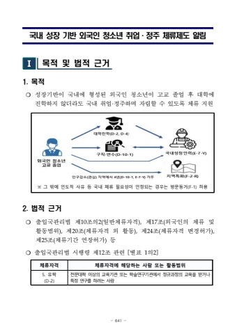 - 641 %uad6d%ub0b4 %uc131%uc7a5 %uae30%ubc18 %uc678%uad6d%uc778 %uccad%uc18c%ub144 %ucde8%uc5c5%u00b7%uc815%uc8fc %uccb4%ub958%uc81c%ub3c4 %uc54c%ub9bc%u2160%ubaa9%uc801 %ubc0f %ubc95%uc801 %uadfc%uac701. %ubaa9%uc801%u274d %uc131%uc7a5%uae30%ubc18%uc774 %uad6d%ub0b4%uc5d0 %ud615%uc131%ub41c %uc678%uad6d%uc778 %uccad%uc18c%ub144%uc774 %uace0%uad50 %uc878%uc5c5 %ud6c4 %ub300%ud559%uc5d0 %uc9c4%ud559%ud558%uc9c0 %uc54a%ub354%ub77c%ub3c4 %uad6d%ub0b4 %ucde8%uc5c5%u00b7%uc815%uc8fc%ud558%uba70 %uc790%ub9bd%ud560 %uc218 %uc788%ub3c4%ub85d %uccb4%ub958 %uc9c0%uc6d0%u203b %uadf8 %ubc16%uc5d0 %uc778%ub3c4%uc801 %uc0ac%uc720 %ub4f1 %uad6d%ub0b4 %uccb4%ub958 %ud544%uc694%uc131%uc774 %uc778%uc815%ub418%ub294 %uacbd%uc6b0%ub294 %ubc29%ubb38%ub3d9%uac70(F-1) %ud5c8%uc6a92. %ubc95%uc801 %uadfc%uac70%u274d %ucd9c%uc785%uad6d%uad00%ub9ac%ubc95 %uc81c10%uc870%uc7582(%uc77c%ubc18%uccb4%ub958%uc790%uaca9),%uc81c17%uc870(%uc678%uad6d%uc778%uc758 %uccb4%ub958 %ubc0f %ud65c%ub3d9%ubc94%uc704),%uc81c20%uc870(%uccb4%ub958%uc790%uaca9 %uc678 %ud65c%ub3d9),%uc81c24%uc870(%uccb4%ub958%uc790%uaca9 %ubcc0%uacbd%ud5c8%uac00),%uc81c25%uc870(%uccb4%ub958%uae30%uac04 %uc5f0%uc7a5%ud5c8%uac00)%ub4f1%u274d %ucd9c%uc785%uad6d%uad00%ub9ac%ubc95 %uc2dc%ud589%ub839 %uc81c12%uc870 %uad00%ub828 [%ubcc4%ud45c 1%uc7582]%uccb4%ub958%uc790%uaca9%uccb4%ub958%uc790%uaca9%uc5d0 %ud574%ub2f9%ud558%ub294 %uc0ac%ub78c %ub610%ub294 %ud65c%ub3d9%ubc94%uc7045. %uc720%ud559(D-2)%uc804%ubb38%ub300%ud559 %uc774%uc0c1%uc758 %uad50%uc721%uae30%uad00 %ub610%ub294 %ud559%uc220%uc5f0%uad6c%uae30%uad00%uc5d0%uc11c %uc815%uaddc%uacfc%uc815%uc758 %uad50%uc721%uc744 %ubc1b%uac70%ub098 %ud2b9%uc815 %uc5f0%uad6c%ub97c %ud558%ub824%ub294 %uc0ac%ub78c