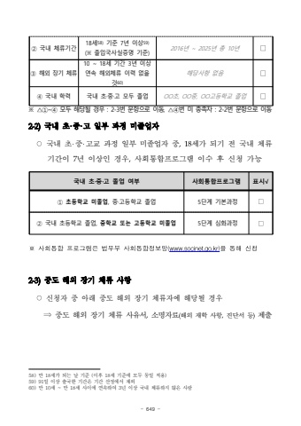 - 649 %u203b %u25b3%u2460~%u2463 %ubaa8%ub450 %ud574%ub2f9%ub420 %uacbd%uc6b0 : 2-3%ubc88 %ubb38%ud56d%uc73c%ub85c %uc774%ub3d9, %u25b3%u2463%ubc88 %ubbf8 %ucda9%uc871%uc790 : 2-2%ubc88 %ubb38%ud56d%uc73c%ub85c %uc774%ub3d92-2)%uad6d%ub0b4 %ucd08%u00b7%uc911%u00b7%uace0 %uc77c%ubd80 %uacfc%uc815 %ubbf8%uc878%uc5c5%uc790%u25cb%uad6d%ub0b4 %ucd08%u2027%uc911%u2027%uace0%uad50 %uacfc%uc815 %uc77c%ubd80 %ubbf8%uc878%uc5c5%uc790 %uc911,18%uc138%uac00%ub418%uae30 %uc804 %uad6d%ub0b4 %uccb4%ub958%uae30%uac04%uc774 7%ub144 %uc774%uc0c1%uc778 %uacbd%uc6b0,%uc0ac%ud68c%ud1b5%ud569%ud504%ub85c%uadf8%ub7a8%uc774%uc218 %ud6c4 %uc2e0%uccad %uac00%ub2a5%uad6d%ub0b4 %ucd08%u00b7%uc911%u00b7%uace0 %uc878%uc5c5 %uc5ec%ubd80%uc0ac%ud68c%ud1b5%ud569%ud504%ub85c%uadf8%ub7a8 %ud45c%uc2dc%u221a%u2460 %ucd08%ub4f1%ud559%uad50 %ubbf8%uc878%uc5c5, %uc911%u00b7%uace0%ub4f1%ud559%uad50 %uc878%uc5c55%ub2e8%uacc4 %uae30%ubcf8%uacfc%uc815%u25a1%u2461 %uad6d%ub0b4 %ucd08%ub4f1%ud559%uad50 %uc878%uc5c5, %uc911%ud559%uad50 %ub610%ub294 %uace0%ub4f1%ud559%uad50 %ubbf8%uc878%uc5c55%ub2e8%uacc4 %uc2ec%ud654%uacfc%uc815%uc0ac%ud68c%ud1b5%ud569%ud504%ub85c%uadf8%ub7a8%uc740%ubc95%ubb34%ubd80%uc0ac%ud68c%ud1b5%ud569%uc815%ubcf4%ub9dd(www.socinet.go.kr)%uc744%ud1b5%ud574%uccad2-3)%uc911%ub3c4 %ud574%uc678 %uc7a5%uae30 %uccb4%ub958 %uc0ac%ud56d%u25cb%uc2e0%uccad%uc790 %uc911 %uc544%ub798 %uc911%ub3c4 %ud574%uc678 %uc7a5%uae30 %uccb4%ub958%uc790%uc5d0 %ud574%ub2f9%ub420 %uacbd%uc6b0%u21d2%uc911%ub3c4 %ud574%uc678 %uc7a5%uae30 %uccb4%ub958 %uc0ac%uc720%uc11c,%uc18c%uba85%uc790%ub8cc(%ud574%uc678 %uc7ac%ud559 %uc0ac%ud56d,%uc9c4%ub2e8%uc11c %ub4f1)%uc81c%ucd9c58)%ub9cc 18%uc138%uac00 %ub418%ub294 %ub0a0 %uae30%uc900 (%uc774%ud6c4 18%uc138 %uae30%uc900%uc5d0 %ubaa8%ub450 %ub3d9%uc77c %uc801%uc6a9)59)91%uc77c %uc774%uc0c1 %ucd9c%uad6d%ud55c %uae30%uac04%uc740 %uae30%uac04 %uc0b0%uc815%uc5d0%uc11c %uc81c%uc67860)%ub9cc 10%uc138 ~ %ub9cc 18%uc138 %uc0ac%uc774%uc5d0 %uc5f0%uc18d%ud558%uc5ec 3%ub144 %uc774%uc0c1 %uad6d%ub0b4 %uccb4%ub958%ud558%uc9c0 %uc54a%uc740 %uc0ac%ub78c%u2461 %uad6d%ub0b4 %uccb4%ub958%uae30%uac0418%uc13858)%uae30%uc900 7%ub144 %uc774%uc0c159)(%u203b %ucd9c%uc785%uad6d%uc0ac%uc2e4%uc99d%uba85 %uae30%uc900)2016%ub144 ~ 2025%ub144 %ucd1d 10%ub144%u25a1%u2462 %ud574%uc678 %uc7a5%uae30 %uccb4%ub95810 ~ 18%uc138 %uae30%uac04 3%ub144 %uc774%uc0c1 %uc5f0%uc18d %ud574%uc678%uccb4%ub958 %uc774%ub825 %uc5c6%uc744 %uac8360)%ud574%ub2f9%uc0ac%ud56d %uc5c6%uc74c%u25a1%u2463 %uad6d%ub0b4 %ud559%ub825%uad6d%ub0b4 %ucd08%u00b7%uc911%u00b7%uace0 %ubaa8%ub450 %uc878%uc5c5OO%ucd08, OO%uc911, OO%uace0%ub4f1%ud559%uad50 %uc878%uc5c5%u25a1