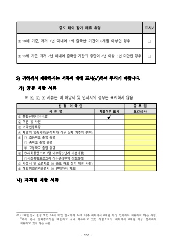 - 650 %uc911%ub3c4 %ud574%uc678 %uc7a5%uae30 %uccb4%ub958 %uc720%ud615%ud45c%uc2dc%u221a%u246018%uc138 %uae30%uc900, %uacfc%uac70 7%ub144 %uc774%ub0b4%uc5d0 1%ud68c %ucd9c%uad6d%ud55c %uae30%uac04%uc774 6%uac1c%uc6d4 %uc774%uc0c1%uc778 %uacbd%uc6b0 %u25a1%u246118%uc138 %uae30%uc900, %uacfc%uac70 7%ub144 %uc774%ub0b4%uc5d0 %ucd9c%uad6d%ud55c %uae30%uac04%uc758 %ucd1d%ud569%uc774 2%ub144 %uc774%uc0c1 3%ub144 %ubbf8%ub9cc%uc778 %uacbd%uc6b0%u25a13)%uadc0%ud558%uaed8%uc11c %uc81c%ucd9c%ud558%uc2dc%ub294 %uc11c%ub958%uc5d0 %ub300%ud574 %ud45c%uc2dc(%u221a)%ud558%uc5ec %uc8fc%uc2dc%uae30 %ubc14%ub78d%ub2c8%ub2e4.%uac00)%uacf5%ud1b5 %uc81c%ucd9c %uc11c%ub958 %u203b%u2465, %u2466, %u2467 %uc11c%ub958%ub294 %ubbf8 %ud574%ub2f9%uc790 %ubc0f %uba74%uc81c%uc790%uc758 %uacbd%uc6b0%ub294 %ud45c%uc2dc%ud558%uc9c0 %uc54a%uc74c%uc2e0 %uccad %uc678 %uad6d %uc778%uacf5 %ubb34 %uc6d0%uc11c %ub958 %uba85%uc81c%ucd9c%uc5ec%ubd80 %ud45c%uc2dc%uc694%uac74%uc2ec%uc0ac%u2460 %ud1b5%ud569%uc2e0%uccad%uc11c(%uc218%uc218%ub8cc)%u221a%u2461 %uc5ec%uad8c %ubc0f %uc0ac%uc9c4%u2462 %uc678%uad6d%uc778%ub4f1%ub85d%uc99d%u2463 %uccb4%ub958%uc9c0 %uc785%uc99d%uc11c%ub958((%uadfc%ubb34%ucc98%uac00 %uc544%ub2cc %uc2e4%uc81c %uac70%uc8fc%uc9c0 %uc6d0%uce59)%u2464%u3260 %ucd08%ub4f1%ud559%uad50 %uc878%uc5c5 %uc99d%uba85%u3261 %uc911%ud559%uad50 %uc878%uc5c5 %uc99d%uba85%u3262 %uace0%ub4f1%ud559%uad50 %uc878%uc5c5 %uc99d%uba85%u2465%u3260%uc0ac%ud68c%ud1b5%ud569%ud504%ub85c%uadf8%ub7a8 %uc774%uc218%uc99d(5%ub2e8%uacc4 %uae30%ubcf8%uacfc%uc815)%u3261%uc0ac%ud68c%ud1b5%ud569%ud504%ub85c%uadf8%ub7a8 %uc774%uc218%uc99d(5%ub2e8%uacc4 %uc2ec%ud654%uacfc%uc815)%u2466 %uc0ac%uc720%uc11c %ubc0f %uc18c%uba85%uc790%ub8cc (%u203b %uc911%ub3c4 %ud574%uc678 %uc7a5%uae30 %uccb4%ub958 %uc0ac%ud56d)%u2467 %ud574%uc678%ubc94%uc8c4%uacbd%ub825%uc99d%uba85%uc11c (%u203b %uba74%uc81c%uc79061)%uc81c%uc678)%ub098)%uc790%uaca9%ubcc4 %uc81c%ucd9c %uc11c%ub95861)%u2460%ub300%ud55c%ubbfc%uad6d %ucd9c%uc0dd %ub610%ub294 14%uc138 %ubbf8%ub9cc %uc785%uad6d%ud558%uc5ec 14%uc138 %uc774%ud6c4 %ud574%uc678%uc5d0%uc11c 6%uac1c%uc6d4 %uc774%uc0c1 %uc5f0%uc18d%ud558%uc5ec %uccb4%ub958%ud558%uc9c0 %uc54a%uc740 %uc0ac%ub78c, %u2461%uacfc%uac70 %ubcf8%uad6d %ubc94%uc8c4%uacbd%ub825%uc11c%ub97c %uc81c%ucd9c%ud558%uace0 %uad6d%ub0b4 %uccb4%ub958%ud558%uace0 %uc788%ub294 %uc0ac%ub78c%uc73c%ub85c%uc11c %ud574%uc678%uc5d0%uc11c 6%uac1c%uc6d4 %uc774%uc0c1 %uc5f0%uc18d%ud558%uc5ec%uccb4%ub958%ud558%uace0 %uc788%uc9c0 %uc54a%uc740 %uc0ac%ub78c