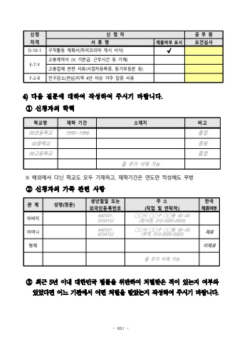 - 651 %uc2e0%uccad%uc790%uaca9%uc2e0 %uccad %uc790%uacf5 %ubb34 %uc6d0%uc11c %ub958 %uba85%uc81c%ucd9c%uc5ec%ubd80 %ud45c%uc2dc%uc694%uac74%uc2ec%uc0acD-10-1%uad6c%uc9c1%ud65c%ub3d9 %uacc4%ud68d%uc11c(%ud558%uc774%ucf54%ub9ac%uc544 %uac8c%uc2dc %uc11c%uc2dd)%u221aE-7-Y%uace0%uc6a9%uacc4%uc57d%uc11c (%u203b %uae30%ubcf8%uae09, %uadfc%ubb34%uc2dc%uac04 %ub4f1 %uae30%uc7ac)%uace0%uc6a9%uc5c5%uccb4 %uad00%ub828 %uc11c%ub958(%uc0ac%uc5c5%uc790%ub4f1%ub85d%uc99d, %ub4f1%uae30%ubd80%ub4f1%ubcf8 %ub4f1)F-2-R%uc778%uad6c%uac10%uc18c(%uad00%uc2ec)%uc9c0%uc5ed 4%ub144 %uc774%uc0c1 %uac70%uc8fc %uc785%uc99d %uc11c%ub9584)%ub2e4%uc74c %uc9c8%ubb38%uc5d0 %ub300%ud558%uc5ec %uc791%uc131%ud558%uc5ec %uc8fc%uc2dc%uae30 %ubc14%ub78d%ub2c8%ub2e4.%u2460%uc2e0%uccad%uc790%uc758 %ud559%ub825%ud559%uad50%uba85%uc7ac%ud559 %uae30%uac04%uc18c%uc7ac%uc9c0%ube44%uace000%ucd08%ub4f1%ud559%uad501990~1996%uc878%uc5c500%uc911%ud559%uad50%uc911%ud1f400%uace0%ub4f1%ud559%uad50%uc878%uc5c5%uc904 %ucd94%uac00 %uc0ad%uc81c %uac00%ub2a5%u203b %ud574%uc678%uc5d0%uc11c %ub2e4%ub2cc%ud559%uad50%ub3c4 %ubaa8%ub450 %uae30%uc7ac%ud558%uace0, %uc7ac%ud559%uae30%uac04%uc740 %uc5f0%ub3c4%ub9cc %uc791%uc131%ud574%ub3c4 %ubb34%ubc29%u2461%uc2e0%uccad%uc790%uc758 %uac00%uc871 %uad00%ub828 %uc0ac%ud56d%u2462%ucd5c%uadfc 5%ub144 %uc774%ub0b4 %ub300%ud55c%ubbfc%uad6d %ubc95%ub960%uc744 %uc704%ubc18%ud558%uc5ec %ucc98%ubc8c%ubc1b%uc740 %uc801%uc774 %uc788%ub294%uc9c0 %uc5ec%ubd80%uc640%uc788%uc5c8%ub2e4%uba74 %uc5b4%ub290 %uae30%uad00%uc5d0%uc11c %uc5b4%ub5a4 %ucc98%ubc8c%uc744 %ubc1b%uc558%ub294%uc9c0 %uc791%uc131%ud558%uc5ec %uc8fc%uc2dc%uae30 %ubc14%ub78d%ub2c8%ub2e4.%uad00 %uacc4%uc131%uba85(%uc601%ubb38)%uc0dd%ub144%uc6d4%uc77c %ub610%ub294 %uc678%uad6d%uc778%ub4f1%ub85d%ubc88%ud638%uc8fc %uc18c(%uc9c1%uc5c5 %ubc0f %uc5f0%ub77d%ucc98)%ud55c%uad6d%uccb4%ub958%uc5ec%ubd80%uc544%ubc84%uc9c0640101-5554152%u25ef%u25ef%uc2dc %u25ef%u25ef%uad6c %u25ef%u25ef%ub3d9 00~00 (%ud68c%uc0ac%uc6d0, 010-0000-0000)%uc5b4%uba38%ub2c8640101-6554152%u25ef%u25ef%uc2dc %u25ef%u25ef%uad6c %u25ef%u25ef%ub3d9 00~00 (%ubb34%uc9c1, 010-0000-0000)%uccb4%ub958%ud615%uc81c%ubbf8%uccb4%ub958%uc904 %ucd94%uac00 %uc0ad%uc81c %uac00%ub2a5