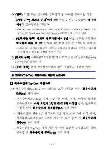 - 657 %u274d (%uacbd%ub825)%uae30%uc5c5 %ub610%ub294 %uc5f0%uad6c%uae30%uad00 %uadfc%ubb34%uacbd%ub825 %uc911 %ud558%ub098%ub97c %ucda9%uc871%ud558%ub294 %uc0ac%ub78c -(%uae30%uc5c5 %uadfc%ubb34)%uc138%uacc4%uc801 %uae30%uc5c5*%uc5d0%uc11c3%ub144%uc774%uc0c1 %uadfc%ubb34%ub97c %ud3ec%ud568%ud558%uc5ec,%ucd1d 8%ub144 %uc774%uc0c1%uc758 %uadfc%ubb34%uacbd%ub825%uc744 %uac00%uc9c4 %uc790 *%ucd5c%uadfc3%ub144%uc774%ub0b4%u2460ForbesGlobal2000(500%uc704%uc774%ub0b4),%u2461FortuneGlobal500(500%uc704%uc774%ub0b4),%u2462Time100WorldMostInfluentialCompanies(100%uc704%uc774%ub0b4)%uc120%uc815%ub41c%uae30%uc5c5-(%uc5f0%uad6c%uae30%uad00 %uadfc%ubb34)%uc138%uacc4%uc801 %uc5f0%uad6c%uae30%uad00*%uc5d0%uc11c 3%ub144%uc774%uc0c1 %uadfc%ubb34%ub97c %ud3ec%ud568%ud558%uc5ec %ubc15%uc0ac%ud559%uc704 %ucde8%ub4dd %ud6c4 5%ub144%uc774%uc0c1%uc758 %ucca8%ub2e8%ubd84%uc57c %uad00%ub828 %uc5f0%uad6c%uacbd%ub825%uc744 %uac00%uc9c4 %uc790*%u2460%ucd5c%uadfc5%ub144%ub0b4%uc138%uacc4%ub300%ud559%uc21c%uc704100%uc704%uc774%ub0b4%uc5d0%uc120%uc815%ub41c%ub300%ud559%uc758%uc5f0%uad6c%uc18c,%u2461%uc138%uacc4%uc801%uae30%uc5c5%uc758%ubd80%uc124%uc5f0%uad6c%uc18c,%u2462%uc815%ubd80%uc8fc%ub3c4%uc5f0%uad6c%uc18c.%u274d (%ud55c%uad6d%uc5b4 %ub2a5%ub825) %uc0ac%ud68c%ud1b5%ud569%ud504%ub85c%uadf8%ub7a8 1%ub2e8%uacc4 %uc774%uc218 %ub610%ub294 %ud55c%uad6d%uc5b4%ub2a5%ub825%uc2dc%ud5d8(TOPIK)1%uae09 %uc774%uc0c1%uc744 %ucde8%ub4dd%ud55c %uc790%u274d (%ubd80%ucc98 %ucd94%ucc9c)%uad00%uacc4 %uc911%uc559%ud589%uc815%uae30%uad00%uc758 %uc7a5%uc774 %uac80%uc99d%ud558%uace0 %ucd94%ucc9c%ud55c %uc0ac%ub78c%u25c8%ud0d1%ud2f0%uc5b4(Top-Tier)%uccb4%ub958%uc790%uaca9%uc740 %ub2e4%uc74c%uacfc %uac19%uc2b5%ub2c8%ub2e4.%u25a1%ucd5c%uc6b0%uc218%uc778%uc7ac(Top-Tier)%uccb4%ub958%uc790%uaca9%u274d %ucd5c%uc6b0%uc218%uc778%uc7ac(Top-Tier)%uc790%uaca9 %uae30%uc900%uc744 %ubaa8%ub450 %ucda9%uc871%ud55c %uacbd%uc6b0 %u2018%ucd5c%uc6b0%uc218%uc778%uc7ac %uac70%uc8fc(F-2)%u2019%uc790%uaca9 %ubd80%uc5ec-%ucd5c%uc6b0%uc218%uc778%uc7ac(Top-Tier)%uc790%uaca9 %uae30%uc900 %uc911 %ud559%ub825,%uacbd%ub825,%ud55c%uad6d%uc5b4 %ub2a5%ub825%uc744 %ucda9%uc871%ud558%uc600%uc73c%ub098 %uc18c%ub4dd %uc694%uac74%uc774 1%uc778%ub2f9 GNI2%ubc30 %uc774%uc0c1%uc778 %uacbd%uc6b0,%uad00%uacc4%ubd80%ucc98 %ucd94%ucc9c%uc744 %ubc1b%uc544 %ucd5c%uc6b0%uc218%uc778%uc7ac %ud2b9%uc815%ud65c%ub3d9(E-7)%uc790%uaca9 %ubd80%uc5ec-`%ucd5c%uc6b0%uc218%uc778%uc7ac %uac70%uc8fc(F-2)%u2019%uc790%uaca9%uc73c%ub85c 3%ub144 %uacbd%uacfc,GNI3%ubc30 %uc774%uc0c1 %uc720%uc9c0,%uc0ac%ud68c%ud1b5%ud569%ud504%ub85c%uadf8%ub7a8(KIIP)3%ub2e8%uacc4 %uc774%uc218 %ub4f1 %uc694%uac74 %ucda9%uc871 %uc2dc %ucd5c%uc6b0%uc218%uc778%uc7ac %uc601%uc8fc(F-5)%uc790%uaca9 %ubd80%uc5ec-%ucd5c%uc6b0%uc218%uc778%uc7ac(Top-Tier)%uc790%uaca9 %uae30%uc900 %uc911 %ud559%ub825 %uc694%uac74%uc744 %uac16%ucd94%uc5c8%uc73c%ub098,%ucde8%uc5c5 %ubbf8%ud655%uc815 %uc2dc %ucd5c%uc6b0%uc218%uc778%uc7ac %uad6c%uc9c1(D-10)%uc790%uaca9 %ubd80%uc5ec