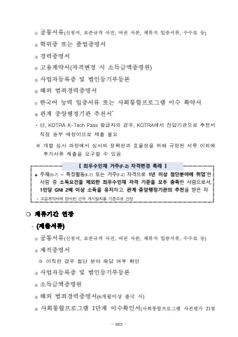 - 663 %u2460 %uacf5%ud1b5%uc11c%ub958(%uc2e0%uccad%uc11c,%ud45c%uc900%uaddc%uaca9 %uc0ac%uc9c4,%uc5ec%uad8c %uc0ac%ubcf8,%uccb4%ub958%uc9c0 %uc785%uc99d%uc11c%ub958,%uc218%uc218%ub8cc %ub4f1)%u2461 %ud559%uc704%uc99d %ub610%ub294 %uc878%uc5c5%uc99d%uba85%uc11c%u2462 %uacbd%ub825%uc99d%uba85%uc11c%u2463%uace0%uc6a9%uacc4%uc57d%uc11c(%uc790%uaca9%ubcc0%uacbd %uc2dc %uc18c%ub4dd%uae08%uc561%uc99d%uba85%uc6d0)%u2464 %uc0ac%uc5c5%uc790%ub4f1%ub85d%uc99d %ubc0f %ubc95%uc778%ub4f1%uae30%ubd80%ub4f1%ubcf8%u2465 %ud574%uc678 %ubc94%uc8c4%uacbd%ub825%uc99d%uba85%uc11c%u2466 %ud55c%uad6d%uc5b4 %ub2a5%ub825 %uc785%uc99d%uc11c%ub958%ub610%ub294 %uc0ac%ud68c%ud1b5%ud569%ud504%ub85c%uadf8%ub7a8 %uc774%uc218 %ud655%uc57d%uc11c%u2467 %uad00%uacc4 %uc911%uc559%ud589%uc815%uae30%uad00 %ucd94%ucc9c%uc11c**%ub2e8,KOTRAK-TechPass%ubc1c%uae09%uc790%uc758%uacbd%uc6b0,KOTRA%uc5d0%uc11c%uc804%ub2f4%uae30%uad00%uc73c%ub85c%ucd94%ucc9c%uc11c%uc9c1%uc811%uc1a1%ubd80%uc608%uc815%uc774%ubbc0%ub85c%uc81c%ucd9c%ubd88%uc694%u203b%uac1c%ubcc4%uc2ec%uc0ac%uacfc%uc815%uc5d0%uc11c%uc2ec%uc0ac%uc758%uc815%ud655%uc131%uacfc%ud6a8%uc728%uc131%uc744%uc704%ud574%uaddc%uc815%ub41c%uc11c%ub958%uc774%uc678%uc5d0%ucd94%uac00%uc11c%ub958%uc81c%ucd9c%uc744%uc694%uad6c%ud560%uc218%uc788%uc74c%u3010 %ucd5c%uc6b0%uc218%uc778%uc7ac %uac70%uc8fc(F-2)%uc790%uaca9%ubcc0%uacbd %ud2b9%ub840 %u3011 %u25b6%uc8fc%uc7ac(D-7) ~%ud2b9%uc815%ud65c%ub3d9(E-7)%ub610%ub294 %uac70%uc8fc(F-2) %uc790%uaca9%uc73c%ub85c 1%ub144 %uc774%uc0c1 %ucca8%ub2e8%ubd84%uc57c%uc5d0 %ucde8%uc5c5*%ud55c%uc0ac%ub78c %uc911 %uc18c%ub4dd%uc694%uac74%uc744 %uc81c%uc678%ud55c %ucd5c%uc6b0%uc218%uc778%uc7ac %uc790%uaca9 %uae30%uc900%uc744 %ubaa8%ub450 %ucda9%uc871%ud55c %uc0ac%ub78c%uc73c%ub85c%uc11c, 1%uc778%ub2f9 GNI 2%ubc30 %uc774%uc0c1 %uc18c%ub4dd%uc744 %uc720%uc9c0%ud558%uace0, %uad00%uacc4 %uc911%uc559%ud589%uc815%uae30%uad00%uc758 %ucd94%ucc9c%uc744 %ubc1b%uc740 %uc790*%uace0%uc6a9%uacc4%uc57d%uc11c%uc5d0%uba85%uc2dc%ub41c%uadfc%ubb34%uac1c%uc2dc%uc77c%uc790%ub97c%uae30%uc900%uc73c%ub85c%uc0b0%uc815%u274d %uccb4%ub958%uae30%uac04 %uc5f0%uc7a5-(%uc81c%ucd9c%uc11c%ub958)%u2460 %uacf5%ud1b5%uc11c%ub958(%uc2e0%uccad%uc11c,%ud45c%uc900%uaddc%uaca9 %uc0ac%uc9c4,%uc5ec%uad8c %uc0ac%ubcf8,%uccb4%ub958%uc9c0 %uc785%uc99d%uc11c%ub958,%uc218%uc218%ub8cc %ub4f1)%u2461%uc7ac%uc9c1%uc99d%uba85%uc11c%u203b%uc774%uc9c1%ud55c%uacbd%uc6b0%ucca8%ub2e8%ubd84%uc57c%ud574%ub2f9%uc5ec%ubd80%ud655%uc778%u2462 %uc0ac%uc5c5%uc790%ub4f1%ub85d%uc99d %ubc0f %ubc95%uc778%ub4f1%uae30%ubd80%ub4f1%ubcf8%u2463 %uc18c%ub4dd%uae08%uc561%uc99d%uba85%uc6d0%u2464 %ud574%uc678 %ubc94%uc8c4%uacbd%ub825%uc99d%uba85%uc11c(6%uac1c%uc6d4%uc774%uc0c1 %ucd9c%uad6d %uc2dc)%u2465 %uc0ac%ud68c%ud1b5%ud569%ud504%ub85c%uadf8%ub7a8 1%ub2e8%uacc4 %uc774%uc218%ud655%uc778%uc11c(%uc0ac%ud68c%ud1b5%ud569%ud504%ub85c%uadf8%ub7a8 %uc0ac%uc804%ud3c9%uac00 21%uc810