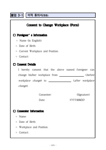 - 670 -%ubd99%uc784 3-1 %uc774%uc801 %ub3d9%uc758%uc11c(%uc601%ubb38)Consent to Change Workplace (Form)%u25a2 Foreigner%u2019s Information %u25e6 Name (in English): %u25e6 Date of Birth: %u25e6 Current Workplace and Position: %u25e6 Contact:%u25a2 Consent DetailsI hereby consent that the above named foreigner can change his/her workplace from (beforeworkplace change) to (after workplace change). Consenter: (Signature)Date: YYYYMMDD %u25a2 Consenter Information%u25e6 Name: %u25e6 Date of Birth: %u25e6 Workplace and Position: %u25e6 Contact: