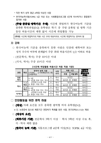 - 677 * %uc9c1%uc804 %ud559%uae30 %uc131%uc801 %ud3c9%uade0 A%ud559%uc810 %uc774%uc0c1%uc778 %uc0ac%ub78c** %ud55c%uad6d%uc5b4%ub2a5%ub825%uc2dc%ud5d8(TOPIK) 5%uae09 %uc774%uc0c1 %ub610%ub294 %uc0ac%ud68c%ud1b5%ud569%ud504%ub85c%uadf8%ub7a8 5%ub2e8%uacc4 %uc774%uc218%ud558%uac70%ub098 %uc885%ud569%ud3c9%uac00 %ud569%uaca9%ud55c %uc0ac%ub78c-(%uc8fc%ub9d0%u00b7%uacf5%ud734%uc77c%u00b7%ubc29%ud559%uae30%uac04 %uc6b0%ub300)%uc2dc%uac04%uc81c %ucde8%uc5c5%ud5c8%uac00 %ud55c%uad6d%uc5b4%ub2a5%ub825 %uae30%uc900%uc744 %ucda9%uc871%ud55c%ud559%uc704%uacfc%uc815(D-2)%uc720%ud559%uc0dd%uc740 %ud559%uae30 %uc911%uc8fc%ub9d0%u2027%uacf5%ud734%uc77c %ubc0f %ubc29%ud559 %uae30%uac04%ub3d9%uc548 %ud5c8%uc6a9%uc2dc%uac04%uc758 %uc81c%ud55c %uc5c6%uc774 %uc2dc%uac04%uc81c %ucde8%uc5c5%ud65c%ub3d9 %uac00%ub2a5%u3010%uc8fc%uc758%u3011%uc2dc%uac04%uc81c %ucde8%uc5c5%ud5c8%uac00%uc758 %ud5c8%uc6a9 %uc2dc%uac04 %uc6b0%ub300 %ub300%uc0c1%uc774%ub77c%ub3c4 %uc2dc%uac04%uc81c %ucde8%uc5c5%ud5c8%uac00%ub294 %ubc1b%uc544%uc57c %ud5683) %uac15%ud654%u25cb%ud55c%uad6d%uc5b4%ub2a5%ub825 %uae30%uc900%uc744 %ucda9%uc871%ud558%uc9c0 %ubabb%ud55c %uc0ac%ub78c%uc740 %uc778%uc99d%ub300 %uc7ac%ud559%uc5ec%ubd80 %ub610%ub294 %uc131%uc801 %uc6b0%uc218%uc790 %uc5ec%ubd80%uc5d0 %uad00%uacc4%uc5c6%uc774 %uc8fc%uc911%ucd5c%ub300 %ud5c8%uc6a9%uc2dc%uac04%uc758 1/2%uc774%ud558%ub85c %ud5c8%uc6a9-(%uc804%ubb38%ud559%uc0ac,%ud559%uc0ac)%uc8fc%uc911 10%uc2dc%uac04 %uc774%ub0b4-(%uc11d%uc0ac,%ubc15%uc0ac)%uc8fc%uc911 15%uc2dc%uac04 %uc774%ub0b4%uacfc%uc815%ud559%ub144%ud55c%uad6d%uc5b4 %ub2a5%ub825 %uae30%uc900%u2460TOPIK, %u2461%uc0ac%ud68c%ud1b5%ud569%ud504%ub85c%uadf8%ub7a8, %u2462%uc138%uc885%ud559%ub2f9%uc2dc%uc791%uc2dc%uae30%ud5c8%uc6a9 %uc2dc%uac04%uc778%uc99d%ub300%ud559%u2027 %uc131%uc801%uc6b0%uc218, %ud55c%uad6d%uc5b4%uc6b0%uc218 (%uc8fc%uc911)%uc8fc%uc911%uc8fc%ub9d0%u2027%ubc29%ud559%uc804%ubb38%ud559%uc0ac-%u2460 3%uae09 %u2461 3%ub2e8%uacc4 %uc774%uc0c1%uc774%uc218 %ub610%ub294 %uc0ac%uc804%ud3c9%uac00 61%uc810 %uc774%uc0c1 %u2462 %uc911%uae091 %uc774%uc0c1 %uc774%uc218X%uc989%uc2dc %uac00%ub2a510%uc2dc%uac0410%uc2dc%uac04%u25cb30%uc2dc%uac04%ubb34%uc81c%ud55c35%uc2dc%uac04%ud559%uc0ac1~2%ud559%ub144X%uc989%uc2dc %uac00%ub2a510%uc2dc%uac0410%uc2dc%uac04%u25cb30%uc2dc%uac04%ubb34%uc81c%ud55c35%uc2dc%uac043~4%ud559%ub144%u2460 4%uae09 %u2461 4%ub2e8%uacc4 %uc774%uc0c1%uc774%uc218 %ub610%ub294 %uc0ac%uc804%ud3c9%uac00 81%uc810 %uc774%uc0c1 %u2462 %uc911%uae092 %uc774%uc0c1 %uc774%uc218X%uc989%uc2dc %uac00%ub2a510%uc2dc%uac0410%uc2dc%uac04%u25cb30%uc2dc%uac04%ubb34%uc81c%ud55c35%uc2dc%uac04%uc11d%u2027%ubc15%uc0ac-X%uc989%uc2dc %uac00%ub2a515%uc2dc%uac0415%uc2dc%uac04%u25cb30%uc2dc%uac04%ubb34%uc81c%ud55c35%uc2dc%uac04%u3010%uc2dc%uac04%uc81c %ucde8%uc5c5%ud65c%ub3d9 %ud5c8%uc6a9%uc2dc%uac04 %ucc28%ub4f1 %uc801%uc6a9 %uae30%uc900%u3011%u25a1 %uc778%ud134%ud65c%ub3d9%uc744 %uc704%ud55c %ud734%ud559 %ud5c8%uc6a9%u25cb(%ub300%uc0c1)%uc544%ub798 %uc694%uac74%uc744 %ubaa8%ub450 %ucda9%uc871%ud55c %uad11%uc5ed%ud615 %ube44%uc790 %uc720%ud559%uc0dd(D-2)%u203b %ub2e8, %ub17c%ubb38%uc900%ube44 %ub4f1%uc73c%ub85c %uccb4%ub958%uae30%uac04 %uc5f0%uc7a5%ud5c8%uac00 %ud2b9%ub840%ub97c %ubc1b%uc740 %uc0ac%ub78c, %uc5f0%uad6c%uc720%ud559(D-2-5)%ub294 %uc81c%uc678%u25cb(%ub300%uc0c1%uc790 %uc694%uac74)-(%uccb4%ub958%uae30%uac04 %uae30%uc900)%uc804%ubb38%ud559%uc0ac 3%ud559%uae30 %uc774%uc0c1 %u2027%ud559%uc0ac 3%ud559%ub144 %uc774%uc0c1 %uc218%ub8cc %ud6c4,%uc11d%u2024%ubc15%uc0ac %uc81c%ud55c %uc5c6%uc74c-(%ud55c%uad6d%uc5b4 %ub2a5%ub825 %uae30%uc900)%uc0ac%ud1b5%ud504%ub85c%uadf8%ub7a8 4%ub2e8%uacc4 %uc774%uc0c1(%ub610%ub294 TOPIK4%uae09 %uc774%uc0c1)