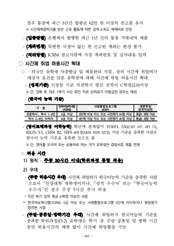 - 685 %uacbd%uc6b0 %ud1b5%uc7a5%uc5d0 %ucd5c%uadfc 1%ub144%uac04 %uc6d4%ud3c9%uade0 62%ub9cc %uc6d0 %uc774%uc0c1%uc758 %uc794%uace0%ub97c %uc720%uc9c0%u203b %uc2dc%uac04%uc81c%ucde8%uc5c5%ud5c8%uac00%ub97c %ubc1b%uc740 %uadfc%ub85c %ud65c%ub3d9%uc5d0 %ub530%ub978 %uae09%uc5ec%u2027%uc18c%ub4dd%ub3c4 %uccb4%uc7ac%ube44%ub85c %uc778%uc815-(%uc785%uc99d%ubc29%ubc95)%uc740%ud589%uc5d0%uc11c %ubc1c%ud589%ud55c %ucd5c%uadfc 1%ub144 %uac04%uc758 %ud1b5%uc7a5 %uac70%ub798%ub0b4%uc5ed %uc81c%ucd9c-(%uacc4%uc88c%ubcc0%uacbd)%ud2b9%ubcc4%ud55c %uc0ac%uc815%uc774 %uc5c6%ub294 %ud55c %uc2e0%uace0%ub41c %uacc4%uc88c%ub294 %ubcc0%uacbd %ubd88%uac00-(%ucc98%ub9ac%ubc29%ubc95)ICRM%ucc38%uace0%uc0ac%ud56d%uc5d0 %uc9c0%uc815 %uacc4%uc88c%ubc88%ud638 %ubc0f %uc2ec%uc0ac%ub0b4%uc6a9 %uc785%ub825%u25a1 %uc2dc%uac04%uc81c %ucde8%uc5c5 %ud5c8%uc6a9%uc2dc%uac04 %ud655%ub300%u25cb%u300c%uc678%uad6d%uc778 %uc720%ud559%uc0dd %uc0ac%uc99d%ubc1c%uae09 %ubc0f %uccb4%ub958%uad00%ub9ac %uc9c0%uce68%u300d%uc0c1%uc758 %uc2dc%uac04%uc81c %ucde8%uc5c5%ud5c8%uac00%ub300%uc0c1%uc790 %uc694%uac74%uc744 %uac16%ucd98 %uc720%ud559%uc0dd%uc5d0 %ub300%ud574 %uc2dc%uac04%uc81c %ucde8%uc5c5 %ud5c8%uc6a9%uc2dc%uac04 %ud655%ub300-(%uc131%uc801%uae30%uc900)%uc2e0%uccad%uc77c %uae30%uc900 %uc9c1%uc804%ud559%uae30 %ud3c9%uade0 %uc131%uc801%uc774 C%ud559%uc810(2.0)%uc774%uc0c1%u203b %ub2e8, %uc785%ud559 %ud6c4 %ucd5c%ucd08 1%ud559%uae30 %uc218%uac15 %uc911%uc778 %uc790%ub85c %uc131%uc801%ud45c%uac00 %ubbf8%ubc1c%uae09%ub41c %uacbd%uc6b0%ub294 %uc81c%uc678-(%ud55c%uad6d%uc5b4 %ub2a5%ub825 %uae30%uc900)%uad6c %ubd84%ud55c%uad6d%uc5b4%ub2a5%ub825%uc2dc%ud5d8(TOPIK)%uc0ac%ud68c%ud1b5%ud569%ud504%ub85c%uadf8%ub7a8(KIIP)%uc138%uc885%ud559%ub2f9%ud55c%uad6d%uc5b4%uacfc%uc815%uc804%ubb38%ud559%uc0ac , %ud559%uc0ac 1~2%ub1443%uae09 %uc774%uc0c13%ub2e8%uacc4 %uc774%uc0c1 %uc774%uc218 %ub610%ub294 %uc0ac%uc804%ud3c9%uac00 61%uc810 %uc774%uc0c1%uc911%uae091 %uacfc%uc815 %uc774%uc0c1%ud559%uc0ac 3~4%ub144, %uc11d%u00b7%ubc15%uc0ac4%uae09 %uc774%uc0c14%ub2e8%uacc4 %uc774%uc0c1 %uc774%uc218 %ub610%ub294 %uc0ac%uc804%ud3c9%uac00 81%uc810 %uc774%uc0c1%uc911%uae092 %uacfc%uc815 %uc774%uc0c1%uc601%uc5b4%ud2b8%ub799%uacfc%uc815 %uc5b4%ud559%ub2a5%ub825%ud559%ub144%uc5d0 %uad00%uacc4%uc5c6%uc774 IELTS5.5,CEFRB2,TEPS601%uc810(NEWTEPS327%uc810)%uc774%uc0c1 %uae30%uc900%uc744 %ucda9%uc871%ud55c%uc0ac%ub78c%uc740%ud55c%uad6d%uc5b4 %ub2a5%ub825 %uae30%uc900%uc744 %ucda9%uc871%ud55c %uac83%uc73c%ub85c %ubd04%u203b %ub2e8, %uc601%uc5b4%ub97c %ubaa8%uad6d%uc5b4 %ub610%ub294 %uacf5%uc6a9%uc5b4%ub85c %ud558%ub294 %uad6d%uac00 %uc720%ud559%uc0dd%uc740 %uc99d%ube59%uc11c%ub958 %uc81c%ucd9c %uba74%uc81c%u25cb%ud5c8%uc6a9 %uc2dc%uac041) %uc6d0%uce59-%uc8fc%uc911 30%uc2dc%uac04 %uc774%ub0b4(%ud559%uc704%uacfc%uc815 %ud1b5%ud569 %uc801%uc6a9)2) %uc6b0%ub300-(%uc8fc%uc911 %ud5c8%uc6a9%uc2dc%uac04 %uc6b0%ub300)%uc2dc%uac04%uc81c %ucde8%uc5c5%ud5c8%uac00%ud55c%uad6d%uc5b4%ub2a5%ub825 %uae30%uc900%uc744 %ucda9%uc871%ud55c%uc0ac%ub78c%uc73c%ub85c%uc11c%u2460%uc778%uc99d%ub300%ud559 %uc7ac%ud559%uc0dd%uc774%uac70%ub098,%u2461%uc131%uc801 %uc6b0%uc218%uc790*%ub610%ub294 %u2462%ud55c%uad6d%uc5b4%ub2a5%ub825 %uc6b0%uc218%uc790**%uc778 %uacbd%uc6b0 %uc8fc%uc911 5%uc2dc%uac04 %ucd94%uac00 %ud5c8%uc6a9* %uc9c1%uc804 %ud559%uae30 %uc131%uc801 %ud3c9%uade0 A%ud559%uc810 %uc774%uc0c1%uc778 %uc0ac%ub78c** %ud55c%uad6d%uc5b4%ub2a5%ub825%uc2dc%ud5d8(TOPIK) 5%uae09 %uc774%uc0c1 %ub610%ub294 %uc0ac%ud68c%ud1b5%ud569%ud504%ub85c%uadf8%ub7a8 5%ub2e8%uacc4 %uc774%uc218%ud558%uac70%ub098 %uc885%ud569%ud3c9%uac00 %ud569%uaca9%ud55c %uc0ac%ub78c-(%uc8fc%ub9d0%u00b7%uacf5%ud734%uc77c%u00b7%ubc29%ud559%uae30%uac04 %uc6b0%ub300)%uc2dc%uac04%uc81c %ucde8%uc5c5%ud5c8%uac00 %ud55c%uad6d%uc5b4%ub2a5%ub825 %uae30%uc900%uc744 %ucda9%uc871%ud55c%ud559%uc704%uacfc%uc815(D-2)%uc720%ud559%uc0dd%uc740 %ud559%uae30 %uc911%uc8fc%ub9d0%u2027%uacf5%ud734%uc77c %ubc0f %ubc29%ud559 %uae30%uac04%ub3d9%uc548 %ud5c8%uc6a9%uc2dc%uac04%uc758 %uc81c%ud55c %uc5c6%uc774 %uc2dc%uac04%uc81c %ucde8%uc5c5%ud65c%ub3d9 %uac00%ub2a5