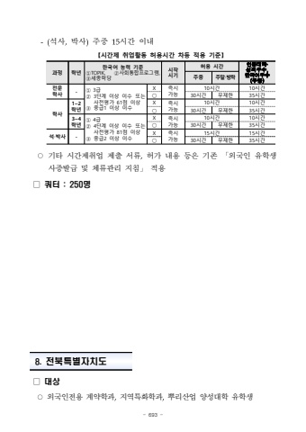 - 693 -(%uc11d%uc0ac,%ubc15%uc0ac)%uc8fc%uc911 15%uc2dc%uac04 %uc774%ub0b4%uacfc%uc815%ud559%ub144%ud55c%uad6d%uc5b4 %ub2a5%ub825 %uae30%uc900%u2460TOPIK, %u2461%uc0ac%ud68c%ud1b5%ud569%ud504%ub85c%uadf8%ub7a8, %u2462%uc138%uc885%ud559%ub2f9%uc2dc%uc791%uc2dc%uae30%ud5c8%uc6a9 %uc2dc%uac04%uc778%uc99d%ub300%ud559%u2027 %uc131%uc801%uc6b0%uc218, %ud55c%uad6d%uc5b4%uc6b0%uc218 (%uc8fc%uc911)%uc8fc%uc911%uc8fc%ub9d0%u2027%ubc29%ud559%uc804%ubb38%ud559%uc0ac-%u2460 3%uae09 %u2461 3%ub2e8%uacc4 %uc774%uc0c1%uc774%uc218 %ub610%ub294 %uc0ac%uc804%ud3c9%uac00 61%uc810 %uc774%uc0c1 %u2462 %uc911%uae091 %uc774%uc0c1 %uc774%uc218X%uc989%uc2dc %uac00%ub2a510%uc2dc%uac0410%uc2dc%uac04%u25cb30%uc2dc%uac04%ubb34%uc81c%ud55c35%uc2dc%uac04%ud559%uc0ac1~2%ud559%ub144X%uc989%uc2dc %uac00%ub2a510%uc2dc%uac0410%uc2dc%uac04%u25cb30%uc2dc%uac04%ubb34%uc81c%ud55c35%uc2dc%uac043~4%ud559%ub144%u2460 4%uae09 %u2461 4%ub2e8%uacc4 %uc774%uc0c1%uc774%uc218 %ub610%ub294 %uc0ac%uc804%ud3c9%uac00 81%uc810 %uc774%uc0c1 %u2462 %uc911%uae092 %uc774%uc0c1 %uc774%uc218X%uc989%uc2dc %uac00%ub2a510%uc2dc%uac0410%uc2dc%uac04%u25cb30%uc2dc%uac04%ubb34%uc81c%ud55c35%uc2dc%uac04%uc11d%u2027%ubc15%uc0ac-X%uc989%uc2dc %uac00%ub2a515%uc2dc%uac0415%uc2dc%uac04%u25cb30%uc2dc%uac04%ubb34%uc81c%ud55c35%uc2dc%uac04%u3010%uc2dc%uac04%uc81c %ucde8%uc5c5%ud65c%ub3d9 %ud5c8%uc6a9%uc2dc%uac04 %ucc28%ub4f1 %uc801%uc6a9 %uae30%uc900%u3011%u25cb%uae30%ud0c0 %uc2dc%uac04%uc81c%ucde8%uc5c5 %uc81c%ucd9c %uc11c%ub958,%ud5c8%uac00 %ub0b4%uc6a9 %ub4f1%uc740 %uae30%uc874%u300c%uc678%uad6d%uc778 %uc720%ud559%uc0dd %uc0ac%uc99d%ubc1c%uae09 %ubc0f %uccb4%ub958%uad00%ub9ac %uc9c0%uce68%u300d%uc801%uc6a9%u25a1 %ucffc%ud130 : 250%uba85%u25a1 %ub300%uc0c1%u25cb%uc678%uad6d%uc778%uc804%uc6a9 %uacc4%uc57d%ud559%uacfc,%uc9c0%uc5ed%ud2b9%ud654%ud559%uacfc,%ubfcc%ub9ac%uc0b0%uc5c5 %uc591%uc131%ub300%ud559 %uc720%ud559%uc0dd8. %uc804%ubd81%ud2b9%ubcc4%uc790%uce58%ub3c4