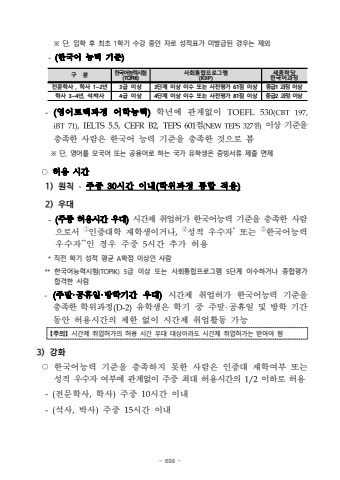 - 699 %u203b %ub2e8, %uc785%ud559 %ud6c4 %ucd5c%ucd08 1%ud559%uae30 %uc218%uac15 %uc911%uc778 %uc790%ub85c %uc131%uc801%ud45c%uac00 %ubbf8%ubc1c%uae09%ub41c %uacbd%uc6b0%ub294 %uc81c%uc678-(%ud55c%uad6d%uc5b4 %ub2a5%ub825 %uae30%uc900)%uad6c %ubd84%ud55c%uad6d%uc5b4%ub2a5%ub825%uc2dc%ud5d8(TOPIK)%uc0ac%ud68c%ud1b5%ud569%ud504%ub85c%uadf8%ub7a8(KIIP)%uc138%uc885%ud559%ub2f9%ud55c%uad6d%uc5b4%uacfc%uc815%uc804%ubb38%ud559%uc0ac , %ud559%uc0ac 1~2%ub1443%uae09 %uc774%uc0c13%ub2e8%uacc4 %uc774%uc0c1 %uc774%uc218 %ub610%ub294 %uc0ac%uc804%ud3c9%uac00 61%uc810 %uc774%uc0c1%uc911%uae091 %uacfc%uc815 %uc774%uc0c1%ud559%uc0ac 3~4%ub144, %uc11d%u00b7%ubc15%uc0ac4%uae09 %uc774%uc0c14%ub2e8%uacc4 %uc774%uc0c1 %uc774%uc218 %ub610%ub294 %uc0ac%uc804%ud3c9%uac00 81%uc810 %uc774%uc0c1%uc911%uae092 %uacfc%uc815 %uc774%uc0c1-(%uc601%uc5b4%ud2b8%ub799%uacfc%uc815 %uc5b4%ud559%ub2a5%ub825)%ud559%ub144%uc5d0 %uad00%uacc4%uc5c6%uc774 TOEFL530(CBT197,iBT71),IELTS5.5,CEFRB2,TEPS601%uc810(NEWTEPS327%uc810)%uc774%uc0c1 %uae30%uc900%uc744%ucda9%uc871%ud55c%uc0ac%ub78c%uc740 %ud55c%uad6d%uc5b4 %ub2a5%ub825 %uae30%uc900%uc744 %ucda9%uc871%ud55c %uac83%uc73c%ub85c %ubd04%u203b %ub2e8, %uc601%uc5b4%ub97c %ubaa8%uad6d%uc5b4 %ub610%ub294 %uacf5%uc6a9%uc5b4%ub85c %ud558%ub294 %uad6d%uac00 %uc720%ud559%uc0dd%uc740 %uc99d%ube59%uc11c%ub958 %uc81c%ucd9c %uba74%uc81c%u25cb%ud5c8%uc6a9 %uc2dc%uac041) %uc6d0%uce59-%uc8fc%uc911 30%uc2dc%uac04 %uc774%ub0b4(%ud559%uc704%uacfc%uc815 %ud1b5%ud569 %uc801%uc6a9)2) %uc6b0%ub300-(%uc8fc%uc911 %ud5c8%uc6a9%uc2dc%uac04 %uc6b0%ub300)%uc2dc%uac04%uc81c %ucde8%uc5c5%ud5c8%uac00%ud55c%uad6d%uc5b4%ub2a5%ub825 %uae30%uc900%uc744 %ucda9%uc871%ud55c%uc0ac%ub78c%uc73c%ub85c%uc11c%u2460%uc778%uc99d%ub300%ud559 %uc7ac%ud559%uc0dd%uc774%uac70%ub098,%u2461%uc131%uc801 %uc6b0%uc218%uc790*%ub610%ub294 %u2462%ud55c%uad6d%uc5b4%ub2a5%ub825 %uc6b0%uc218%uc790**%uc778 %uacbd%uc6b0 %uc8fc%uc911 5%uc2dc%uac04 %ucd94%uac00 %ud5c8%uc6a9* %uc9c1%uc804 %ud559%uae30 %uc131%uc801 %ud3c9%uade0 A%ud559%uc810 %uc774%uc0c1%uc778 %uc0ac%ub78c** %ud55c%uad6d%uc5b4%ub2a5%ub825%uc2dc%ud5d8(TOPIK) 5%uae09 %uc774%uc0c1 %ub610%ub294 %uc0ac%ud68c%ud1b5%ud569%ud504%ub85c%uadf8%ub7a8 5%ub2e8%uacc4 %uc774%uc218%ud558%uac70%ub098 %uc885%ud569%ud3c9%uac00 %ud569%uaca9%ud55c %uc0ac%ub78c-(%uc8fc%ub9d0%u00b7%uacf5%ud734%uc77c%u00b7%ubc29%ud559%uae30%uac04 %uc6b0%ub300)%uc2dc%uac04%uc81c %ucde8%uc5c5%ud5c8%uac00 %ud55c%uad6d%uc5b4%ub2a5%ub825 %uae30%uc900%uc744 %ucda9%uc871%ud55c%ud559%uc704%uacfc%uc815(D-2)%uc720%ud559%uc0dd%uc740 %ud559%uae30 %uc911%uc8fc%ub9d0%u2027%uacf5%ud734%uc77c %ubc0f %ubc29%ud559 %uae30%uac04%ub3d9%uc548 %ud5c8%uc6a9%uc2dc%uac04%uc758 %uc81c%ud55c %uc5c6%uc774 %uc2dc%uac04%uc81c %ucde8%uc5c5%ud65c%ub3d9 %uac00%ub2a5%u3010%uc8fc%uc758%u3011%uc2dc%uac04%uc81c %ucde8%uc5c5%ud5c8%uac00%uc758 %ud5c8%uc6a9 %uc2dc%uac04 %uc6b0%ub300 %ub300%uc0c1%uc774%ub77c%ub3c4 %uc2dc%uac04%uc81c %ucde8%uc5c5%ud5c8%uac00%ub294 %ubc1b%uc544%uc57c %ud5683) %uac15%ud654%u25cb%ud55c%uad6d%uc5b4%ub2a5%ub825 %uae30%uc900%uc744 %ucda9%uc871%ud558%uc9c0 %ubabb%ud55c %uc0ac%ub78c%uc740 %uc778%uc99d%ub300 %uc7ac%ud559%uc5ec%ubd80 %ub610%ub294 %uc131%uc801 %uc6b0%uc218%uc790 %uc5ec%ubd80%uc5d0 %uad00%uacc4%uc5c6%uc774 %uc8fc%uc911%ucd5c%ub300 %ud5c8%uc6a9%uc2dc%uac04%uc758 1/2%uc774%ud558%ub85c %ud5c8%uc6a9-(%uc804%ubb38%ud559%uc0ac,%ud559%uc0ac)%uc8fc%uc911 10%uc2dc%uac04 %uc774%ub0b4-(%uc11d%uc0ac,%ubc15%uc0ac)%uc8fc%uc911 15%uc2dc%uac04 %uc774%ub0b4
