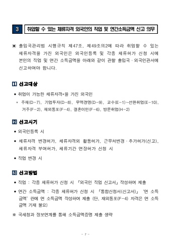 - 7 -3%ucde8%uc5c5%ud560 %uc218 %uc788%ub294 %uccb4%ub958%uc790%uaca9 %uc678%uad6d%uc778%uc758 %uc9c1%uc5c5 %ubc0f %uc5f0%uac04%uc18c%ub4dd%uae08%uc561 %uc2e0%uace0 %uc758%ubb34%u25a3 %ucd9c%uc785%uad6d%uad00%ub9ac%ubc95 %uc2dc%ud589%uaddc%uce59 %uc81c47%uc870, %uc81c49%uc870%uc7582%uc5d0 %ub530%ub77c %ucde8%uc5c5%ud560 %uc218 %uc788%ub294 %uccb4%ub958%uc790%uaca9%uc744 %uac00%uc9c4 %uc678%uad6d%uc778%uc740 %uc678%uad6d%uc778%ub4f1%ub85d %ubc0f %uac01%uc885 %uccb4%ub958%ud5c8%uac00 %uc2e0%uccad %uc2dc%uc5d0 %ubcf8%uc778%uc758 %uc9c1%uc5c5 %ubc0f %uc5f0%uac04 %uc18c%ub4dd%uae08%uc561%uc744 %uc544%ub798%uc640 %uac19%uc774 %uad00%ud560 %ucd9c%uc785%uad6d%u00b7%uc678%uad6d%uc778%uad00%uc11c%uc5d0%uc2e0%uace0%ud558%uc5ec%uc57c %ud569%ub2c8%ub2e4. %uf000 %uc2e0%uace0%ub300%uc0c1%u2022 %ucde8%uc5c5%uc774 %uac00%ub2a5%ud55c %uccb4%ub958%uc790%uaca9*%uc744 %uac00%uc9c4 %uc678%uad6d%uc778* %uc8fc%uc7ac(D-7), %uae30%uc5c5%ud22c%uc790(D-8), %ubb34%uc5ed%uacbd%uc601(D-9), %uad50%uc218(E-1)~%uc120%uc6d0%ucde8%uc5c5(E-10), %uac70%uc8fc(F-2), %uc7ac%uc678%ub3d9%ud3ec(F-4), %uacb0%ud63c%uc774%ubbfc(F-6), %ubc29%ubb38%ucde8%uc5c5(H-2)%uf000 %uc2e0%uace0%uc2dc%uae30%u2022 %uc678%uad6d%uc778%ub4f1%ub85d %uc2dc%u2022 %uccb4%ub958%uc790%uaca9 %ubcc0%uacbd%ud5c8%uac00, %uccb4%ub958%uc790%uaca9%uc678 %ud65c%ub3d9%ud5c8%uac00, %uadfc%ubb34%ucc98%ubcc0%uacbd%u00b7%ucd94%uac00%ud5c8%uac00(%uc2e0%uace0), %uccb4%ub958%uc790%uaca9 %ubd80%uc5ec%ud5c8%uac00, %uccb4%ub958%uae30%uac04 %uc5f0%uc7a5%ud5c8%uac00 %uc2e0%uccad %uc2dc%u2022 %uc9c1%uc5c5 %ubcc0%uacbd %uc2dc%uf000 %uc2e0%uace0%ubc29%ubc95%u2022 %uc9c1%uc5c5 : %uac01%uc885 %uccb4%ub958%ud5c8%uac00 %uc2e0%uccad %uc2dc %u300c%uc678%uad6d%uc778 %uc9c1%uc5c5 %uc2e0%uace0%uc11c%u300d%uc791%uc131%ud558%uc5ec %uc81c%ucd9c%u2022 %uc5f0%uac04 %uc18c%ub4dd%uae08%uc561 : %uac01%uc885 %uccb4%ub958%ud5c8%uac00 %uc2e0%uccad %uc2dc %u300c%ud1b5%ud569%uc2e0%uccad%uc11c(%uc2e0%uace0%uc11c)%u300d%u2018%uc5f0 %uc18c%ub4dd%uae08%uc561%u2019%ub780%uc5d0 %uc5f0 %uc18c%ub4dd%uae08%uc561 %uc791%uc131%ud558%uc5ec %uc81c%ucd9c (%ub2e8, %uc7ac%uc678%ub3d9%ud3ec(F-4) %uc790%uaca9%uc740 %uc5f0 %uc18c%ub4dd%uae08%uc561 %uae30%uc7ac %ubd88%uc694)%u203b %uad6d%uc138%uccad%uacfc %uc815%ubcf4%uc5f0%uacc4%ub97c %ud1b5%ud574 %uc18c%ub4dd%uae08%uc561%uc99d%uba85 %uc81c%ucd9c %uc0dd%ub7b5