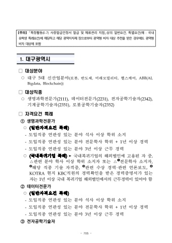 - 705 %u3010%uc8fc%uc758%u3011%u300c%ud2b9%uc815%ud65c%ub3d9(E-7) %uc0ac%uc99d%ubc1c%uae09%uc778%uc815%uc11c %ubc1c%uae09 %ubc0f %uccb4%ub958%uad00%ub9ac %uc9c0%uce68%u300d%uc0c1%uc758 %uc77c%ubc18%uc694%uac74, %ud2b9%ubcc4%uc694%uac74(%uc608 : %uad6d%ub0b4 %uc720%ud559%uc0dd %ud2b9%ub840%uc694%uac74)%uc5d0 %ud574%ub2f9%ud558%uace0 %ud574%ub2f9 %uad11%uc5ed%uc9c0%uc790%uccb4 %uc7a5%uc73c%ub85c%ubd80%ud130 %uad11%uc5ed%ud615 %ube44%uc790 %ub300%uc0c1 %ucd94%ucc9c%uc744 %ubc1b%uc740 %uacbd%uc6b0%uc5d0%ub3c4 %uad11%uc5ed%ud615 %ube44%uc790 %ub300%uc0c1%uc5d0 %ud3ec%ud568%u25a1 %ub300%uc0c1%ubd84%uc57c%u25cb%ub300%uad6c 5%ub300 %uc2e0%uc0b0%uc5c5%ubd84%uc57c(%ub85c%ubd07,%ubc18%ub3c4%uccb4,%ubbf8%ub798%ubaa8%ube4c%ub9ac%ud2f0,%ud5ec%uc2a4%ucf00%uc5b4,ABB(AI,Bigdata,Blockchain))%u25a1 %ub300%uc0c1%uc9c1%uc885%u25cb%uc0dd%uba85%uacfc%ud559%uc804%ubb38%uac00(2111),%ub370%uc774%ud130%uc804%ubb38%uac00(2231),%uc804%uc790%uacf5%ud559%uae30%uc220%uc790(2342),%uae30%uacc4%uacf5%ud559%uae30%uc220%uc790(2351),%ub85c%ubd07%uacf5%ud559%uae30%uc220%uc790(2352)%u25a1 %uc790%uaca9%uc694%uac74 %ud2b9%ub840%u2460 %uc0dd%uba85%uacfc%ud559%uc804%ubb38%uac00%u25cb(%uc77c%ubc18%uc790%uaca9%uc694%uac74 %ud2b9%ub840-%ub3c4%uc785%uc9c1%uc885 %uc5f0%uad00%uc131 %uc788%ub294 %ubd84%uc57c %uc11d%uc0ac %uc774%uc0c1 %ud559%uc704 %uc18c%uc9c0-%ub3c4%uc785%uc9c1%uc885 %uc5f0%uad00%uc131 %uc788%ub294 %ubd84%uc57c %uc804%ubb38%ud559%uc0ac %ud559%uc704 +1%ub144 %uc774%uc0c1 %uacbd%ub825-%ub3c4%uc785%uc9c1%uc885 %uc5f0%uad00%uc131 %uc788%ub294 %ubd84%uc57c 3%ub144 %uc774%uc0c1 %uadfc%ubb34 %uacbd%ub825%u25cb(%uad6d%ub0b4%ubcf5%uadc0%uae30%uc5c5 %ud2b9%ub840)%uf000%uad6d%ub0b4%ubcf5%uadc0%uae30%uc5c5%uc758 %ud574%uc678%ubc95%uc778%uc5d0 %uace0%uc6a9%ub41c %uc790 %uc911,%u25b3%uad00%ub828 %ubd84%uc57c %ud559%uc0ac %uc774%uc0c1 %ud559%uc704 %uc18c%uc9c0%uc790 %ub610%ub294 %u25b3%u278a%uc804%ubb38%ud559%uc0ac %uc18c%uc9c0%uc790,%u278b%ud574%ub2f9 %uc9c1%uc885 %uae30%uc220 %uc790%uaca9%uc99d,%u278c%uad00%ub828 %uc218%uc0c1 %uacbd%ub825%u00b7%uad00%ub828 %uc5b8%ub860%ubcf4%ub3c4,%u278dKOTRA%ud604%uc9c0 KBC%uc9c1%uc6d0%uc758 %uacbd%ub825%ud655%uc778%uc744 %ubc1b%uc740 %uacbd%ub825%uc99d%uba85%uc11c%uac00 %uc788%ub294%uc790%ub294 1%ub144 %uc774%uc0c1 %uad6d%ub0b4 %ubcf5%uadc0%uae30%uc5c5 %ud574%uc678%ubc95%uc778%uc5d0%uc11c%uc758 %uadfc%ubb34%uacbd%ub825%uc774 %uc788%uc5b4%uc57c %ud568%u2461 %ub370%uc774%ud130%uc804%ubb38%uac00%u25cb(%uc77c%ubc18%uc790%uaca9%uc694%uac74 %ud2b9%ub840)-%ub3c4%uc785%uc9c1%uc885 %uc5f0%uad00%uc131 %uc788%ub294 %ubd84%uc57c %uc11d%uc0ac %uc774%uc0c1 %ud559%uc704 %uc18c%uc9c0-%ub3c4%uc785%uc9c1%uc885 %uc5f0%uad00%uc131 %uc788%ub294 %ubd84%uc57c %uc804%ubb38%ud559%uc0ac %ud559%uc704 +1%ub144 %uc774%uc0c1 %uacbd%ub825-%ub3c4%uc785%uc9c1%uc885 %uc5f0%uad00%uc131 %uc788%ub294 %ubd84%uc57c 3%ub144 %uc774%uc0c1 %uadfc%ubb34 %uacbd%ub825%u2462 %uc804%uc790%uacf5%ud559%uae30%uc220%uc7901. %ub300%uad6c%uad11%uc5ed%uc2dc