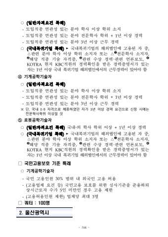 - 706 %u25cb(%uc77c%ubc18%uc790%uaca9%uc694%uac74 %ud2b9%ub840)-%ub3c4%uc785%uc9c1%uc885 %uc5f0%uad00%uc131 %uc788%ub294 %ubd84%uc57c %ud559%uc0ac %uc774%uc0c1 %ud559%uc704 %uc18c%uc9c0-%ub3c4%uc785%uc9c1%uc885 %uc5f0%uad00%uc131 %uc788%ub294 %ubd84%uc57c %uc804%ubb38%ud559%uc0ac %ud559%uc704 +1%ub144 %uc774%uc0c1 %uacbd%ub825-%ub3c4%uc785%uc9c1%uc885 %uc5f0%uad00%uc131 %uc788%ub294 %ubd84%uc57c 3%ub144 %uc774%uc0c1 %uadfc%ubb34 %uacbd%ub825%u25cb(%uad6d%ub0b4%ubcf5%uadc0%uae30%uc5c5 %ud2b9%ub840)%uf000%uad6d%ub0b4%ubcf5%uadc0%uae30%uc5c5%uc758 %ud574%uc678%ubc95%uc778%uc5d0 %uace0%uc6a9%ub41c %uc790 %uc911,%u25b3%uad00%ub828 %ubd84%uc57c %ud559%uc0ac %uc774%uc0c1 %ud559%uc704 %uc18c%uc9c0%uc790 %ub610%ub294 %u25b3%u278a%uc804%ubb38%ud559%uc0ac %uc18c%uc9c0%uc790,%u278b%ud574%ub2f9 %uc9c1%uc885 %uae30%uc220 %uc790%uaca9%uc99d,%u278c%uad00%ub828 %uc218%uc0c1 %uacbd%ub825%u00b7%uad00%ub828 %uc5b8%ub860%ubcf4%ub3c4,%u278dKOTRA%ud604%uc9c0 KBC%uc9c1%uc6d0%uc758 %uacbd%ub825%ud655%uc778%uc744 %ubc1b%uc740 %uacbd%ub825%uc99d%uba85%uc11c%uac00 %uc788%ub294%uc790%ub294 1%ub144 %uc774%uc0c1 %uad6d%ub0b4 %ubcf5%uadc0%uae30%uc5c5 %ud574%uc678%ubc95%uc778%uc5d0%uc11c%uc758 %uadfc%ubb34%uacbd%ub825%uc774 %uc788%uc5b4%uc57c %ud568%u2463 %uae30%uacc4%uacf5%ud559%uae30%uc220%uc790%u25cb(%uc77c%ubc18%uc790%uaca9%uc694%uac74 %ud2b9%ub840)-%ub3c4%uc785%uc9c1%uc885 %uc5f0%uad00%uc131 %uc788%ub294 %ubd84%uc57c %ud559%uc0ac %uc774%uc0c1 %ud559%uc704 %uc18c%uc9c0-%ub3c4%uc785%uc9c1%uc885 %uc5f0%uad00%uc131 %uc788%ub294 %ubd84%uc57c %uc804%ubb38%ud559%uc0ac %ud559%uc704 +1%ub144 %uc774%uc0c1 %uacbd%ub825-%ub3c4%uc785%uc9c1%uc885 %uc5f0%uad00%uc131 %uc788%ub294 %ubd84%uc57c 3%ub144 %uc774%uc0c1 %uadfc%ubb34 %uacbd%ub825%u203b %ub2e8, %uad6d%ub0b4 E-9 %uc790%uaca9%uc73c%ub85c %uccb4%ub958%ud558%uc600%ub358 %uc790%uac00 3%ub144 %uc774%uc0c1 %uacbd%ub825 %uc694%uac74%uc73c%ub85c %uc2e0%uccad %uc2dc%uc5d0%ub294 %uc804%ubb38%ud559%uc0ac%ud559%uc704 %uc774%uc0c1%uc77c %uac83%u2464 %ub85c%ubd07%uacf5%ud559%uae30%uc220%uc790%u25cb(%uc77c%ubc18%uc790%uaca9%uc694%uac74 %ud2b9%ub840%uad6d%ub0b4%u017e%uc678 %ud559%uc0ac %ud559%uc704 %uc774%uc0c1 %ub144 %uc774%uc0c1 %uacbd%ub825%u25cb(%uad6d%ub0b4%ubcf5%uadc0%uae30%uc5c5 %ud2b9%ub840)%uf000%uad6d%ub0b4%ubcf5%uadc0%uae30%uc5c5%uc758 %ud574%uc678%ubc95%uc778%uc5d0 %uace0%uc6a9%ub41c %uc790 %uc911,%u25b3%uad00%ub828 %ubd84%uc57c %ud559%uc0ac %uc774%uc0c1 %ud559%uc704 %uc18c%uc9c0%uc790 %ub610%ub294 %u25b3%u278a%uc804%ubb38%ud559%uc0ac %uc18c%uc9c0%uc790,%u278b%ud574%ub2f9 %uc9c1%uc885 %uae30%uc220 %uc790%uaca9%uc99d,%u278c%uad00%ub828 %uc218%uc0c1 %uacbd%ub825%u00b7%uad00%ub828 %uc5b8%ub860%ubcf4%ub3c4,%u278dKOTRA%ud604%uc9c0 KBC%uc9c1%uc6d0%uc758 %uacbd%ub825%ud655%uc778%uc744 %ubc1b%uc740 %uacbd%ub825%uc99d%uba85%uc11c%uac00 %uc788%ub294%uc790%ub294 1%ub144 %uc774%uc0c1 %uad6d%ub0b4 %ubcf5%uadc0%uae30%uc5c5 %ud574%uc678%ubc95%uc778%uc5d0%uc11c%uc758 %uadfc%ubb34%uacbd%ub825%uc774 %uc788%uc5b4%uc57c %ud568%u25a1 %uad6d%ubbfc%uace0%uc6a9%ubcf4%ud638 %uae30%uc900 %ud2b9%ub840%u25cb%uae30%uacc4%uacf5%ud559%uae30%uc220%uc790-%uad6d%ubbfc %uace0%uc6a9%uc778%uc6d0 30%%ubc94%uc704 %ub0b4 %uc678%uad6d%uc778 %uace0%uc6a9 %ud5c8%uc6a9-(%uace0%uc6a9%uc5c5%uccb4 %uc694%uac74 %ub4f1)%uad6d%ubbfc%uace0%uc6a9 %ubcf4%ud638%ub97c %uc704%ud55c %uc2ec%uc0ac%uae30%uc900%uc744 %uc900%uc6a9%ud558%ub418%uc0c1%uc2dc%uadfc%ub85c%uc790 %uc218%uac00 5%uc778 %ubbf8%ub9cc%uc778 %uacbd%uc6b0 %uace0%uc6a9 %uc81c%ud55c-(%uace0%uc6a9%ud5c8%uc6a9%uc778%uc6d0 %uc81c%ud55c)%uc5c5%uccb4%ub2f9 %ucd5c%ub300 3%uba85%u25a1 %ucffc%ud130 : 100%uba852. %uc6b8%uc0b0%uad11%uc5ed%uc2dc