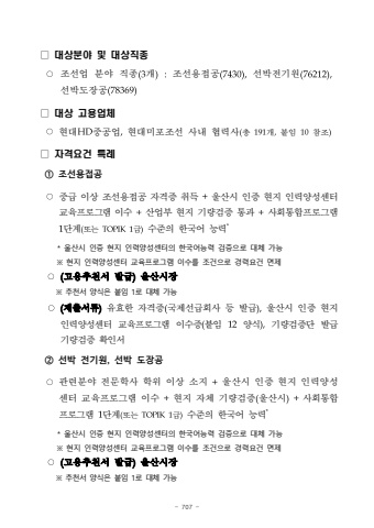 - 707 %u25a1 %ub300%uc0c1%ubd84%uc57c %ubc0f %ub300%uc0c1%uc9c1%uc885%u25cb%uc870%uc120%uc5c5 %ubd84%uc57c %uc9c1%uc885(3%uac1c):%uc870%uc120%uc6a9%uc811%uacf5(7430),%uc120%ubc15%uc804%uae30%uc6d0(76212),%uc120%ubc15%ub3c4%uc7a5%uacf5(78369)%u25a1 %ub300%uc0c1 %uace0%uc6a9%uc5c5%uccb4%u25cb%ud604%ub300HD%uc911%uacf5%uc5c5,%ud604%ub300%ubbf8%ud3ec%uc870%uc120 %uc0ac%ub0b4 %ud611%ub825%uc0ac(%ucd1d 191%uac1c,%ubd99%uc784 10%ucc38%uc870)%u25a1 %uc790%uaca9%uc694%uac74 %ud2b9%ub840%u2460 %uc870%uc120%uc6a9%uc811%uacf5%u25cb%uc911%uae09 %uc774%uc0c1 %uc870%uc120%uc6a9%uc811%uacf5 %uc790%uaca9%uc99d %ucde8%ub4dd +%uc6b8%uc0b0%uc2dc %uc778%uc99d %ud604%uc9c0 %uc778%ub825%uc591%uc131%uc13c%ud130 %uad50%uc721%ud504%ub85c%uadf8%ub7a8%uc774%uc218 +%uc0b0%uc5c5%ubd80 %ud604%uc9c0 %uae30%ub7c9%uac80%uc99d %ud1b5%uacfc +%uc0ac%ud68c%ud1b5%ud569%ud504%ub85c%uadf8%ub7a8 1%ub2e8%uacc4(%ub610%ub294 TOPIK1%uae09)%uc218%uc900%uc758 %ud55c%uad6d%uc5b4 %ub2a5%ub825** %uc6b8%uc0b0%uc2dc %uc778%uc99d %ud604%uc9c0 %uc778%ub825%uc591%uc131%uc13c%ud130%uc758 %ud55c%uad6d%uc5b4%ub2a5%ub825 %uac80%uc99d%uc73c%ub85c %ub300%uccb4 %uac00%ub2a5%u203b %ud604%uc9c0 %uc778%ub825%uc591%uc131%uc13c%ud130 %uad50%uc721%ud504%ub85c%uadf8%ub7a8 %uc774%uc218%ub97c %uc870%uac74%uc73c%ub85c %uacbd%ub825%uc694%uac74 %uba74%uc81c(%uace0%uc6a9%ucd94%ucc9c%uc11c %ubc1c%uae09)%uc6b8%uc0b0%uc2dc%uc7a5%u203b %ucd94%ucc9c%uc11c %uc591%uc2dd%uc740 %ubd99%uc784 1%ub85c %ub300%uccb4 %uac00%ub2a5%u25cb(%uc81c%ucd9c%uc11c%ub958)%uc720%ud6a8%ud55c %uc790%uaca9%uc99d(%uad6d%uc81c%uc120%uae09%ud68c%uc0ac %ub4f1 %ubc1c%uae09),%uc6b8%uc0b0%uc2dc %uc778%uc99d %ud604%uc9c0 %uc778%ub825%uc591%uc131%uc13c%ud130 %uad50%uc721%ud504%ub85c%uadf8%ub7a8 %uc774%uc218%uc99d(%ubd99%uc784 12%uc591%uc2dd),%uae30%ub7c9%uac80%uc99d%ub2e8 %ubc1c%uae09 %uae30%ub7c9%uac80%uc99d %ud655%uc778%uc11c%u2461 %uc120%ubc15 %uc804%uae30%uc6d0, %uc120%ubc15 %ub3c4%uc7a5%uacf5%u25cb%uad00%ub828%ubd84%uc57c %uc804%ubb38%ud559%uc0ac %ud559%uc704 %uc774%uc0c1 %uc18c%uc9c0 +%uc6b8%uc0b0%uc2dc %uc778%uc99d %ud604%uc9c0 %uc778%ub825%uc591%uc131%uc13c%ud130 %uad50%uc721%ud504%ub85c%uadf8%ub7a8 %uc774%uc218 +%ud604%uc9c0 %uc790%uccb4 %uae30%ub7c9%uac80%uc99d(%uc6b8%uc0b0%uc2dc)+%uc0ac%ud68c%ud1b5%ud569%ud504%ub85c%uadf8%ub7a8 1%ub2e8%uacc4(%ub610%ub294 TOPIK1%uae09)%uc218%uc900%uc758 %ud55c%uad6d%uc5b4 %ub2a5%ub825** %uc6b8%uc0b0%uc2dc %uc778%uc99d %ud604%uc9c0 %uc778%ub825%uc591%uc131%uc13c%ud130%uc758 %ud55c%uad6d%uc5b4%ub2a5%ub825 %uac80%uc99d%uc73c%ub85c %ub300%uccb4 %uac00%ub2a5%u203b %ud604%uc9c0 %uc778%ub825%uc591%uc131%uc13c%ud130 %uad50%uc721%ud504%ub85c%uadf8%ub7a8 %uc774%uc218%ub97c %uc870%uac74%uc73c%ub85c %uacbd%ub825%uc694%uac74 %uba74%uc81c%u25cb(%uace0%uc6a9%ucd94%ucc9c%uc11c %ubc1c%uae09)%uc6b8%uc0b0%uc2dc%uc7a5%u203b %ucd94%ucc9c%uc11c %uc591%uc2dd%uc740 %ubd99%uc784 1%ub85c %ub300%uccb4 %uac00%ub2a5