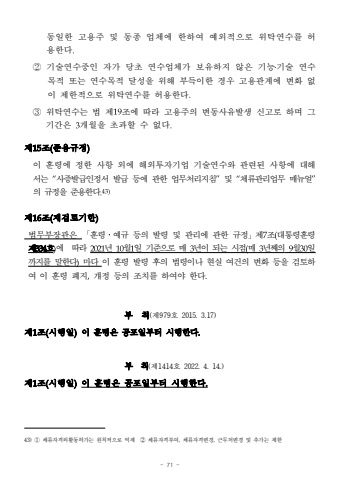 - 71 -%ub3d9%uc77c%ud55c %uace0%uc6a9%uc8fc %ubc0f %ub3d9%uc885 %uc5c5%uccb4%uc5d0 %ud55c%ud558%uc5ec %uc608%uc678%uc801%uc73c%ub85c %uc704%ud0c1%uc5f0%uc218%ub97c %ud5c8%uc6a9%ud55c%ub2e4.%u2461 %uae30%uc220%uc5f0%uc218%uc911%uc778 %uc790%uac00 %ub2f9%ucd08 %uc5f0%uc218%uc5c5%uccb4%uac00 %ubcf4%uc720%ud558%uc9c0 %uc54a%uc740 %uae30%ub2a5%u2024%uae30%uc220 %uc5f0%uc218%ubaa9%uc801 %ub610%ub294 %uc5f0%uc218%ubaa9%uc801 %ub2ec%uc131%uc744 %uc704%ud574 %ubd80%ub4dd%uc774%ud55c %uacbd%uc6b0 %uace0%uc6a9%uad00%uacc4%uc5d0%ubcc0%ud654 %uc5c6%uc774 %uc81c%ud55c%uc801%uc73c%ub85c %uc704%ud0c1%uc5f0%uc218%ub97c %ud5c8%uc6a9%ud55c%ub2e4.%u2462 %uc704%ud0c1%uc5f0%uc218%ub294 %ubc95 %uc81c19%uc870%uc5d0 %ub530%ub77c %uace0%uc6a9%uc8fc%uc758 %ubcc0%ub3d9%uc0ac%uc720%ubc1c%uc0dd %uc2e0%uace0%ub85c %ud558%uba70%uadf8 %uae30%uac04%uc740 3%uac1c%uc6d4%uc744 %ucd08%uacfc%ud560 %uc218 %uc5c6%ub2e4.%uc81c15%uc870(%uc900%uc6a9%uaddc%uc815)%uc774 %ud6c8%ub839%uc5d0 %uc815%ud55c %uc0ac%ud56d %uc678%uc5d0 %ud574%uc678%ud22c%uc790%uae30%uc5c5 %uae30%uc220%uc5f0%uc218%uc640 %uad00%ub828%ub41c %uc0ac%ud56d%uc5d0%ub300%ud574%uc11c%ub294 %u201c%uc0ac%uc99d%ubc1c%uae09%uc778%uc815%uc11c %ubc1c%uae09 %ub4f1%uc5d0 %uad00%ud55c %uc5c5%ubb34%ucc98%ub9ac%uc9c0%uce68%u201d%ubc0f %u201c%uccb4%ub958%uad00%ub9ac%uc5c5%ubb34 %ub9e4%ub274%uc5bc%u201d%uc758 %uaddc%uc815%uc744 %uc900%uc6a9%ud55c%ub2e4.43)%uc81c16%uc870(%uc7ac%uac80%ud1a0%uae30%ud55c)%ubc95%ubb34%ubd80%uc7a5%uad00%uc740 %u300c%ud6c8%ub839%u2024%uc608%uaddc %ub4f1%uc758 %ubc1c%ub839 %ubc0f %uad00%ub9ac%uc5d0 %uad00%ud55c %uaddc%uc815%u300d%uc81c7%uc870(%ub300%ud1b5%ub839%ud6c8%ub839%uc81c334%ud638)%uc5d0 %ub530%ub77c 2021%ub144 10%uc6d41%uc77c %uae30%uc900%uc73c%ub85c %ub9e4 3%ub144%uc774 %ub418%ub294 %uc2dc%uc810(%ub9e4 3%ub144%uc9f8%uc7589%uc6d430%uc77c%uae4c%uc9c0%ub97c %ub9d0%ud55c%ub2e4)%ub9c8%ub2e4 %uc774%ud6c8%ub839 %ubc1c%ub839 %ud6c4%uc758 %ubc95%ub839%uc774%ub098 %ud604%uc2e4 %uc5ec%uac74%uc758 %ubcc0%ud654 %ub4f1%uc744 %uac80%ud1a0%ud558%uc5ec %uc774 %ud6c8%ub839 %ud3d0%uc9c0,%uac1c%uc815 %ub4f1%uc758 %uc870%uce58%ub97c %ud558%uc5ec%uc57c %ud55c%ub2e4.%ubd80 %uce59(%uc81c979%ud638 2015. 3.17)%uc81c1%uc870(%uc2dc%ud589%uc77c)%uc774 %ud6c8%ub839%uc740 %uacf5%ud3ec%uc77c%ubd80%ud130 %uc2dc%ud589%ud55c%ub2e4.%ubd80 %uce59(%uc81c1414%ud638 2022. 4. 14.)%uc81c1%uc870(%uc2dc%ud589%uc77c)%uc774 %ud6c8%ub839%uc740 %uacf5%ud3ec%uc77c%ubd80%ud130 %uc2dc%ud589%ud55c%ub2e4.43)%u2460 %uccb4%ub958%uc790%uaca9%uc678%ud65c%ub3d9%ud5c8%uac00%ub294 %uc6d0%uce59%uc801%uc73c%ub85c %uc5b5%uc81c %u2461 %uccb4%ub958%uc790%uaca9%ubd80%uc5ec, %uccb4%ub958%uc790%uaca9%ubcc0%uacbd, %uadfc%ubb34%ucc98%ubcc0%uacbd %ubc0f %ucd94%uac00%ub294 %uc81c%ud55c