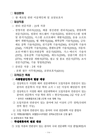 - 710 %u25a1 %ub300%uc0c1%ubd84%uc57c%u25cb%uad11%u2027%uc81c%uc870%uc5c5 %uad00%ub828 %uc774%uacf5%uacc4%uc778%uc7ac %ubc0f %uc694%uc591%ubcf4%ud638%uc0ac%u25a1 %ub300%uc0c1%uc9c1%uc885%u25cb%uad00%ub9ac%uff65%uc804%ubb38%uc9c1%uc885 :23%uac1c %uc9c1%uc885-%uacbd%uc601%uc9c0%uc6d0 %uad00%ub9ac%uc790(1212),%uc81c%ud488 %uc0dd%uc0b0%uad00%ub828 %uad00%ub9ac%uc790(1413),%uc0dd%uba85%uacfc%ud559 %uc804%ubb38%uac00(2111),%ucef4%ud4e8%ud130 %ud558%ub4dc%uc6e8%uc5b4 %uae30%uc220%uc790(2211),%ucef4%ud4e8%ud130%uc2dc%uc2a4%ud15c %uc124%uacc4%ubc0f %ubd84%uc11d%uac00(2221),%uc2dc%uc2a4%ud15c %uc18c%ud504%ud2b8%uc6e8%uc5b4 %uac1c%ubc1c%uc790(2222),%uc751%uc6a9 %uc18c%ud504%ud2b8%uc6e8%uc5b4 %uac1c%ubc1c%uc790(2223),%uc6f9 %uac1c%ubc1c%uc790(2224),%ud654%ud559%uacf5%ud559 %uae30%uc220%uc790(2321),%uae08%uc18d%u00b7%uc7ac%ub8cc %uacf5%ud559 %uae30%uc220%uc790(2331),%uc804%uae30%uacf5%ud559 %uae30%uc220%uc790(2341),%uc804%uc790%uacf5%ud559 %uae30%uc220%uc790(2342),%uae30%uacc4%uacf5%ud559 %uae30%uc220%uc790(2351),%ud50c%ub79c%ud2b8%uacf5%ud559 %uae30%uc220%uc790(23512),%uc790%ub3d9%ucc28%u00b7%uc870%uc120%u00b7%ube44%ud589%uae30%u00b7%ucca0%ub3c4%ucc28%ub7c9%uacf5%ud559 %uc804%ubb38%uac00(S2353),%uac00%uc2a4%u00b7%uc5d0%ub108%uc9c0 %uae30%uc220%uc790(2372),%uc12c%uc720%uacf5%ud559 %uae30%uc220%uc790(2392),%uc81c%ub3c4%uc0ac(2395),%uc0c1%ud488%uae30%ud68d %uc804%ubb38%uac00(2731),%uc5ec%ud589%uc0c1%ud488 %uac1c%ubc1c%uc790(2732),%uad11%uace0 %ubc0f %ud64d%ubcf4 %uc804%ubb38%uac00(2733),%uc870%uc0ac%uc804%ubb38%uac00(2734),%uae30%uc220 %uc601%uc5c5%uc6d0(2743)%u25cb%uc900%uc804%ubb38 %uc9c1%uc885 :2%uac1c %uc9c1%uc885%ud638%ud154 %uc811%uc218 %uc0ac%ubb34%uc6d0%uc694%uc591%ubcf4%ud638%uc0ac%u25a1 %uc790%uaca9%uc694%uac74 %ud2b9%ub840%u25cb%uc0ac%uc99d%ubc1c%uae09%uc778%uc815%uc11c %ubc1c%uae09 %ub300%uc0c1%u2460%uacbd%uc0c1%ubd81%ub3c4%uac00 %uc9c0%uc815%ud55c %ud574%uc678 %uc804%ubb38%ub300%ud559%uc5d0%uc11c %ub3c4%uc785%uc9c1%uc885%uacfc %uc5f0%uad00%uc131%uc774 %uc788%ub294%ubd84%uc57c%uc758 %uc804%ubb38%ud559%uc0ac %uc774%uc0c1 %ud559%uc704 %uc18c%uc9c0 +1%ub144 %uc774%uc0c1%uc758 %ud574%ub2f9%ubd84%uc57c %uacbd%ub825%u2461%uacbd%uc0c1%ubd81%ub3c4%uac00 %uc9c0%uc815%ud55c %ud574%uc678 %uc804%ubb38%ub300%ud559%uc5d0%uc11c %ub3c4%uc785%uc9c1%uc885%uacfc %uc5f0%uad00%uc131%uc774 %uc788%ub294%ubd84%uc57c%uc758 %uc804%ubb38%ud559%uc0ac %uc774%uc0c1 %ud559%uc704 %ucde8%ub4dd +%ud55c%uad6d%uc5b4(TOPIK)2%uae09 %uc774%uc0c1 %uc18c%uc9c0** %uc628%ub77c%uc778 %uc0ac%ud68c%ud1b5%ud569%ud504%ub85c%uadf8%ub7a8 2%ub2e8%uacc4 %uc218%ub8cc %ub300%uccb4 %uac00%ub2a5%u2462%ub3c4%uc785%uc9c1%uc885%uacfc %uc5f0%uad00%uc131%uc774 %uc788%ub294 %ubd84%uc57c%uc5d0 3%ub144 %uc774%uc0c1%uc758 %uadfc%ubb34 %uacbd%ub825(%uad6d%ub0b4%uc678%uacbd%ub825 %ud569%uc0b0 %uac00%ub2a5)%u2463%ub3c4%uc785 %uc9c1%uc885%uacfc %uc5f0%uad00%uc131%uc774 %uc788%ub294 %ubd84%uc57c%uc758 %uad6d%ub0b4 %uc804%ubb38%ub300%ud559 %uc774%uc0c1 %uc878%uc5c5%uc790%u203b %ub2e8, %uc5ec%ud589%uc0c1%ud488%uac1c%ubc1c%uc790, %ud638%ud154%uc811%uc218%uc0ac%ubb34%uc6d0%uc740 %uacbd%ub825%uc694%uac74%ub9cc%uc73c%ub85c %uc2e0%uccad %ubd88%uac00%u203b %uc694%uc591%ubcf4%ud638%uc0ac %uc801%uc6a9 %uc81c%uc678%u25cb%uad6d%ub0b4%uccb4%ub958%uc790%uaca9 %ubcc0%uacbd %ub300%uc0c1%u2464%ub3c4%uc785 %uc9c1%uc885%uacfc %uc5f0%uad00%uc131%uc774 %uc788%ub294 %ubd84%uc57c%uc758 %uad6d%ub0b4 %uc804%ubb38%ub300%ud559 %uc774%uc0c1 %uc878%uc5c5(%uc608%uc815)%uc790