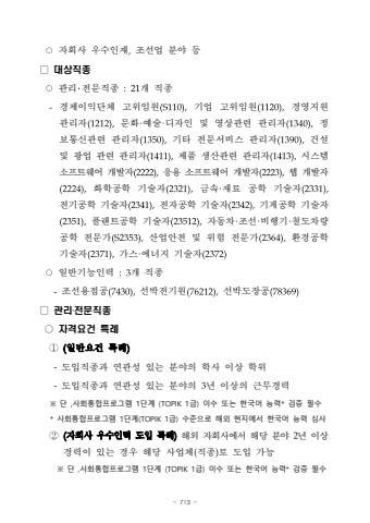 - 713 %u25cb%uc790%ud68c%uc0ac %uc6b0%uc218%uc778%uc7ac,%uc870%uc120%uc5c5 %ubd84%uc57c %ub4f1%u25a1 %ub300%uc0c1%uc9c1%uc885%u25cb%uad00%ub9ac%uff65%uc804%ubb38%uc9c1%uc885 :21%uac1c %uc9c1%uc885-%uacbd%uc81c%uc774%uc775%ub2e8%uccb4 %uace0%uc704%uc784%uc6d0(S110),%uae30%uc5c5 %uace0%uc704%uc784%uc6d0(1120),%uacbd%uc601%uc9c0%uc6d0 %uad00%ub9ac%uc790(1212),%ubb38%ud654%u00b7%uc608%uc220%u00b7%ub514%uc790%uc778 %ubc0f %uc601%uc0c1%uad00%ub828 %uad00%ub9ac%uc790(1340),%uc815%ubcf4%ud1b5%uc2e0%uad00%ub828 %uad00%ub9ac%uc790(1350),%uae30%ud0c0 %uc804%ubb38%uc11c%ube44%uc2a4 %uad00%ub9ac%uc790(1390),%uac74%uc124 %ubc0f %uad11%uc5c5 %uad00%ub828 %uad00%ub9ac%uc790(1411),%uc81c%ud488 %uc0dd%uc0b0%uad00%ub828 %uad00%ub9ac%uc790(1413),%uc2dc%uc2a4%ud15c%uc18c%ud504%ud2b8%uc6e8%uc5b4 %uac1c%ubc1c%uc790(2222),%uc751%uc6a9 %uc18c%ud504%ud2b8%uc6e8%uc5b4 %uac1c%ubc1c%uc790(2223),%uc6f9 %uac1c%ubc1c%uc790(2224),%ud654%ud559%uacf5%ud559 %uae30%uc220%uc790(2321),%uae08%uc18d%u00b7%uc7ac%ub8cc %uacf5%ud559 %uae30%uc220%uc790(2331),%uc804%uae30%uacf5%ud559 %uae30%uc220%uc790(2341),%uc804%uc790%uacf5%ud559 %uae30%uc220%uc790(2342),%uae30%uacc4%uacf5%ud559 %uae30%uc220%uc790(2351),%ud50c%ub79c%ud2b8%uacf5%ud559 %uae30%uc220%uc790(23512),%uc790%ub3d9%ucc28%u00b7%uc870%uc120%u00b7%ube44%ud589%uae30%u00b7%ucca0%ub3c4%ucc28%ub7c9%uacf5%ud559 %uc804%ubb38%uac00(S2353),%uc0b0%uc5c5%uc548%uc804 %ubc0f %uc704%ud5d8 %uc804%ubb38%uac00(2364),%ud658%uacbd%uacf5%ud559 %uae30%uc220%uc790(2371),%uac00%uc2a4%u00b7%uc5d0%ub108%uc9c0 %uae30%uc220%uc790(2372)%uc77c%ubc18%uae30%ub2a5%uc778%ub825 :3%uac1c %uc9c1%uc885-%uc870%uc120%uc6a9%uc811%uacf5(7430),%uc120%ubc15%uc804%uae30%uc6d0(76212),%uc120%ubc15%ub3c4%uc7a5%uacf5(78369)%u25a1 %uad00%ub9ac%u2027%uc804%ubb38%uc9c1%uc885%u25cb %uc790%uaca9%uc694%uac74 %ud2b9%ub840%u2460(%uc77c%ubc18%uc694%uac74 %ud2b9%ub840)-%ub3c4%uc785%uc9c1%uc885%uacfc %uc5f0%uad00%uc131 %uc788%ub294 %ubd84%uc57c%uc758 %ud559%uc0ac %uc774%uc0c1 %ud559%uc704-%ub3c4%uc785%uc9c1%uc885%uacfc %uc5f0%uad00%uc131 %uc788%ub294 %ubd84%uc57c%uc758 3%ub144 %uc774%uc0c1%uc758 %uadfc%ubb34%uacbd%ub825 %u203b %ub2e8 ,%uc0ac%ud68c%ud1b5%ud569%ud504%ub85c%uadf8%ub7a8 1%ub2e8%uacc4 (TOPIK 1%uae09) %uc774%uc218 %ub610%ub294 %ud55c%uad6d%uc5b4 %ub2a5%ub825* %uac80%uc99d %ud544%uc218* %uc0ac%ud68c%ud1b5%ud569%ud504%ub85c%uadf8%ub7a8 1%ub2e8%uacc4(TOPIK 1%uae09) %uc218%uc900%uc73c%ub85c %ud574%uc678 %ud604%uc9c0%uc5d0%uc11c %ud55c%uad6d%uc5b4 %ub2a5%ub825 %uc2ec%uc0ac%u2461(%uc790%ud68c%uc0ac %uc6b0%uc218%uc778%ub825 %ub3c4%uc785 %ud2b9%ub840)%ud574%uc678 %uc790%ud68c%uc0ac%uc5d0%uc11c %ud574%ub2f9 %ubd84%uc57c 2%ub144 %uc774%uc0c1%uacbd%ub825%uc774 %uc788%ub294 %uacbd%uc6b0 %ud574%ub2f9 %uc0ac%uc5c5%uccb4(%uc9c1%uc885)%ub85c %ub3c4%uc785 %uac00%ub2a5%u203b %ub2e8 ,%uc0ac%ud68c%ud1b5%ud569%ud504%ub85c%uadf8%ub7a8 1%ub2e8%uacc4 (TOPIK 1%uae09) %uc774%uc218 %ub610%ub294 %ud55c%uad6d%uc5b4 %ub2a5%ub825* %uac80%uc99d %ud544%uc218