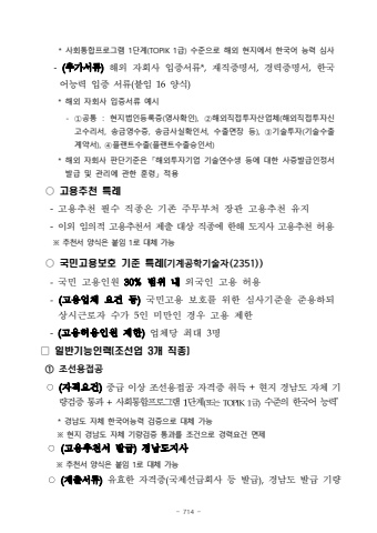 - 714 * %uc0ac%ud68c%ud1b5%ud569%ud504%ub85c%uadf8%ub7a8 1%ub2e8%uacc4(TOPIK 1%uae09) %uc218%uc900%uc73c%ub85c %ud574%uc678 %ud604%uc9c0%uc5d0%uc11c %ud55c%uad6d%uc5b4 %ub2a5%ub825 %uc2ec%uc0ac-(%ucd94%uac00%uc11c%ub958)%ud574%uc678 %uc790%ud68c%uc0ac %uc785%uc99d%uc11c%ub958*,%uc7ac%uc9c1%uc99d%uba85%uc11c,%uacbd%ub825%uc99d%uba85%uc11c,%ud55c%uad6d%uc5b4%ub2a5%ub825 %uc785%uc99d %uc11c%ub958(%ubd99%uc784 16%uc591%uc2dd)* %ud574%uc678 %uc790%ud68c%uc0ac %uc785%uc99d%uc11c%ub958 %uc608%uc2dc- %u2460%uacf5%ud1b5 : %ud604%uc9c0%ubc95%uc778%ub4f1%ub85d%uc99d(%uc601%uc0ac%ud655%uc778), %u2461%ud574%uc678%uc9c1%uc811%ud22c%uc790%uc0b0%uc5c5%uccb4(%ud574%uc678%uc9c1%uc811%ud22c%uc790%uc2e0%uace0%uc218%ub9ac%uc11c, %uc1a1%uae08%uc601%uc218%uc99d, %uc1a1%uae08%uc0ac%uc2e4%ud655%uc778%uc11c, %uc218%ucd9c%uba74%uc7a5 %ub4f1), %u2462%uae30%uc220%ud22c%uc790(%uae30%uc220%uc218%ucd9c%uacc4%uc57d%uc11c), %u2463%ud50c%ub79c%ud2b8%uc218%ucd9c(%ud50c%ub79c%ud2b8%uc218%ucd9c%uc2b9%uc778%uc11c)* %ud574%uc678 %uc790%ud68c%uc0ac %ud310%ub2e8%uae30%uc900%uc740 %u300c%ud574%uc678%ud22c%uc790%uae30%uc5c5 %uae30%uc220%uc5f0%uc218%uc0dd %ub4f1%uc5d0 %ub300%ud55c %uc0ac%uc99d%ubc1c%uae09%uc778%uc815%uc11c%ubc1c%uae09 %ubc0f %uad00%ub9ac%uc5d0 %uad00%ud55c %ud6c8%ub839%u300d %uc801%uc6a9%u25cb %uace0%uc6a9%ucd94%ucc9c %ud2b9%ub840-%uace0%uc6a9%ucd94%ucc9c %ud544%uc218 %uc9c1%uc885%uc740 %uae30%uc874 %uc8fc%ubb34%ubd80%ucc98 %uc7a5%uad00 %uace0%uc6a9%ucd94%ucc9c %uc720%uc9c0-%uc774%uc678 %uc784%uc758%uc801 %uace0%uc6a9%ucd94%ucc9c%uc11c %uc81c%ucd9c %ub300%uc0c1 %uc9c1%uc885%uc5d0 %ud55c%ud574 %ub3c4%uc9c0%uc0ac %uace0%uc6a9%ucd94%ucc9c%ud5c8%uc6a9%u203b %ucd94%ucc9c%uc11c %uc591%uc2dd%uc740 %ubd99%uc784 1%ub85c %ub300%uccb4 %uac00%ub2a5%u25cb %uad6d%ubbfc%uace0%uc6a9%ubcf4%ud638 %uae30%uc900 %ud2b9%ub840(%uae30%uacc4%uacf5%ud559%uae30%uc220%uc790(2351))-%uad6d%ubbfc %uace0%uc6a9%uc778%uc6d0 30%%ubc94%uc704 %ub0b4%uc678%uad6d%uc778 %uace0%uc6a9 %ud5c8%uc6a9-(%uace0%uc6a9%uc5c5%uccb4 %uc694%uac74 %ub4f1)%uad6d%ubbfc%uace0%uc6a9 %ubcf4%ud638%ub97c %uc704%ud55c %uc2ec%uc0ac%uae30%uc900%uc744 %uc900%uc6a9%ud558%ub418%uc0c1%uc2dc%uadfc%ub85c%uc790 %uc218%uac00 5%uc778 %ubbf8%ub9cc%uc778 %uacbd%uc6b0 %uace0%uc6a9 %uc81c%ud55c-(%uace0%uc6a9%ud5c8%uc6a9%uc778%uc6d0 %uc81c%ud55c)%uc5c5%uccb4%ub2f9 %ucd5c%ub300 3%uba85%u25a1 %uc77c%ubc18%uae30%ub2a5%uc778%ub825(%uc870%uc120%uc5c5 3%uac1c %uc9c1%uc885)%u2460 %uc870%uc120%uc6a9%uc811%uacf5%u25cb(%uc790%uaca9%uc694%uac74)%uc911%uae09 %uc774%uc0c1 %uc870%uc120%uc6a9%uc811%uacf5 %uc790%uaca9%uc99d %ucde8%ub4dd +%ud604%uc9c0 %uacbd%ub0a8%ub3c4 %uc790%uccb4%uae30%ub7c9%uac80%uc99d %ud1b5%uacfc +%uc0ac%ud68c%ud1b5%ud569%ud504%ub85c%uadf8%ub7a8 1%ub2e8%uacc4(%ub610%ub294 TOPIK1%uae09)%uc218%uc900%uc758 %ud55c%uad6d%uc5b4 %ub2a5%ub825** %uacbd%ub0a8%ub3c4 %uc790%uccb4 %ud55c%uad6d%uc5b4%ub2a5%ub825 %uac80%uc99d%uc73c%ub85c %ub300%uccb4 %uac00%ub2a5%u203b %ud604%uc9c0 %uacbd%ub0a8%ub3c4 %uc790%uccb4 %uae30%ub7c9%uac80%uc99d %ud1b5%uacfc%ub97c %uc870%uac74%uc73c%ub85c %uacbd%ub825%uc694%uac74 %uba74%uc81c%u25cb(%uace0%uc6a9%ucd94%ucc9c%uc11c %ubc1c%uae09)%uacbd%ub0a8%ub3c4%uc9c0%uc0ac%u203b %ucd94%ucc9c%uc11c %uc591%uc2dd%uc740 %ubd99%uc784 1%ub85c %ub300%uccb4 %uac00%ub2a5%u25cb(%uc81c%ucd9c%uc11c%ub958)%uc720%ud6a8%ud55c %uc790%uaca9%uc99d(%uad6d%uc81c%uc120%uae09%ud68c%uc0ac %ub4f1 %ubc1c%uae09),%uacbd%ub0a8%ub3c4 %ubc1c%uae09 %uae30%ub7c9