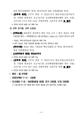 - 715 %uac80%uc99d %ud655%uc778%uc11c(%ubd99%uc78417%uc591%uc2dd),%ud55c%uad6d%uc5b4%ub2a5%ub825 %uc785%uc99d %uc11c%ub958(%ubd99%uc78416%uc591%uc2dd)%u25cb(%uadfc%ubb34%ucc98 %ubcc0%uacbd)%uadfc%ubb34%ucc98 %ubcc0%uacbd %uc2dc %uacbd%ub0a8%ub3c4%uc9c0%uc0ac %ubc1c%uae09%uc11c%ub958(%uace0%uc6a9%ucd94%ucc9c%uc11c %ubc0f %uae30%uc5c5%uccb4 %ud604%uc7a5%uc2e4%uc0ac %ubcf4%uace0%uc11c(%uae30%uc874 %uc870%uc120%ud574%uc591%ud50c%ub79c%ud2b8%ud611%ud68c %uc591%uc2dd %uc0ac%uc6a9)(%ubd80%ub4dd%uc774%ud55c %uadfc%ubb34%ucc98 %ubcc0%uacbd %uc2dc))%ub85c %uc0b0%uc5c5%ubd80%uc7a5%uad00%uace0%uc6a9%ucd94%ucc9c %ub300%uccb4 %u203b%ud544%uc218%u203b %ucd94%ucc9c%uc11c %uc591%uc2dd%uc740 %ubd99%uc784 1%ub85c %ub300%uccb4 %uac00%ub2a5%u2461 %uc120%ubc15 %uc804%uae30%uc6d0, %uc120%ubc15 %ub3c4%uc7a5%uacf5%u25cb(%uc790%uaca9%uc694%uac74)%uad00%ub828%ubd84%uc57c %uc804%ubb38%ud559%uc0ac %ud559%uc704 %uc774%uc0c1 %uc18c%uc9c0 +%ud604%uc9c0 %uacbd%ub0a8%ub3c4 %uc790%uccb4%uae30%ub7c9%uac80%uc99d %ud1b5%uacfc+%uc0ac%ud68c%ud1b5%ud569%ud504%ub85c%uadf8%ub7a8 1%ub2e8%uacc4(%ub610%ub294 TOPIK1%uae09)%uc218%uc900%uc758 %ud55c%uad6d%uc5b4 %ub2a5%ub825** %uacbd%ub0a8%ub3c4 %uc790%uccb4 %ud55c%uad6d%uc5b4%ub2a5%ub825 %uac80%uc99d%uc73c%ub85c %ub300%uccb4 %uac00%ub2a5%u203b %ud604%uc9c0 %uacbd%ub0a8%ub3c4 %uc790%uccb4 %uae30%ub7c9%uac80%uc99d %ud1b5%uacfc%ub97c %uc870%uac74%uc73c%ub85c %uacbd%ub825%uc694%uac74 %uba74%uc81c-(%ucd94%uac00%uc11c%ub958)%uacbd%ub0a8%ub3c4 %ubc1c%uae09 %uae30%ub7c9%uac80%uc99d %ud655%uc778%uc11c(%ubd99%uc784 17%uc591%uc2dd),%ud55c%uad6d%uc5b4%ub2a5%ub825%uc785%uc99d %uc11c%ub958(%ubd99%uc78416%uc591%uc2dd)%u25cb(%uace0%uc6a9%ucd94%ucc9c%uc11c %ubc1c%uae09)%uacbd%ub0a8%ub3c4%uc9c0%uc0ac%u203b %ucd94%ucc9c%uc11c %uc591%uc2dd%uc740 %ubd99%uc784 1%ub85c %ub300%uccb4 %uac00%ub2a5%uadfc%ubb34%ucc98 %ubcc0%uacbd%uadfc%ubb34%ucc98 %ubcc0%uacbd %uc2dc %uacbd%ub0a8%ub3c4%uc9c0%uc0ac %ubc1c%uae09%uc11c%ub958%uace0%uc6a9%ucd94%ucc9c%uc11c %ubc0f %uae30%uc5c5%uccb4 %ud604%uc7a5%uc2e4%uc0ac %ubcf4%uace0%uc11c(%uae30%uc874 %uc870%uc120%ud574%uc591%ud50c%ub79c%ud2b8%ud611%ud68c %uc591%uc2dd %uc0ac%uc6a9)(%ubd80%ub4dd%uc774%ud55c %uadfc%ubb34%ucc98 %ubcc0%uacbd %uc2dc))%ub85c %uc0b0%uc5c5%ubd80%uc7a5%uad00%uace0%uc6a9%ucd94%ucc9c %ub300%uccb4 %u203b%ud544%uc218%u203b %ucd94%ucc9c%uc11c %uc591%uc2dd%uc740 %ubd99%uc784 1%ub85c %ub300%uccb4 %uac00%ub2a5%u25a1 %ucffc%ud130 : %ucd1d 670%uba85- %uc804%ubb38%uc778%ub825(E-7-1) : 130%uba85- %uc870%uc120%uc5c5(E-7-3) : 540%uba85(%uc6a9%uc811 80%uba85, %uc804%uae30 230%uba85, %ub3c4%uc7a5 230%uba85)%u203b %uc0ac%uc5c5%uc2dc%ud589 %uc911 3%uac1c %uc9c1%uc885%ubcc4 %ucffc%ud130 %uc870%uc815%uc774 %ud544%uc694%ud560 %uacbd%uc6b0 %ubc95%ubb34%ubd80%uc640 %uc0ac%uc804%ud611%uc758 %ud544%uc694