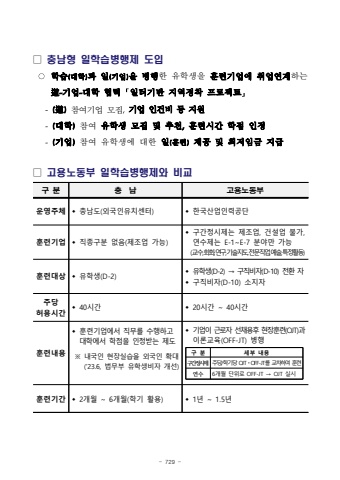 - 729 %u25a1%ucda9%ub0a8%ud615 %uc77c%ud559%uc2b5%ubcd1%ud589%uc81c %ub3c4%uc785%u25cb%ud559%uc2b5(%ub300%ud559)%uacfc %uc77c(%uae30%uc5c5)%uc744 %ubcd1%ud589%ud55c %uc720%ud559%uc0dd%uc744%ud6c8%ub828%uae30%uc5c5%uc5d0 %ucde8%uc5c5%uc5f0%uacc4%ud558%ub294%u9053-%uae30%uc5c5-%ub300%ud559 %ud611%ub825 %uff62%uc77c%ud130%uae30%ubc18 %uc9c0%uc5ed%uc815%ucc29 %ud504%ub85c%uc81d%ud2b8%uff63-(%u9053)%ucc38%uc5ec%uae30%uc5c5 %ubaa8%uc9d1,%uae30%uc5c5 %uc778%uac74%ube44 %ub4f1 %uc9c0%uc6d0-(%ub300%ud559)%ucc38%uc5ec %uc720%ud559%uc0dd %ubaa8%uc9d1 %ubc0f %ucd94%ucc9c,%ud6c8%ub828%uc2dc%uac04 %ud559%uc810 %uc778%uc815 -(%uae30%uc5c5)%ucc38%uc5ec %uc720%ud559%uc0dd%uc5d0 %ub300%ud55c %uc77c(%ud6c8%ub828)%uc81c%uacf5 %ubc0f %ucd5c%uc800%uc784%uae08 %uc9c0%uae09 %u25a1 %uace0%uc6a9%ub178%ub3d9%ubd80 %uc77c%ud559%uc2b5%ubcd1%ud589%uc81c%uc640 %ube44%uad50%uad6c %ubd84%ucda9 %ub0a8%uace0%uc6a9%ub178%ub3d9%ubd80%uc6b4%uc601%uc8fc%uccb4w %ucda9%ub0a8%ub3c4(%uc678%uad6d%uc778%uc720%uce58%uc13c%ud130)w %ud55c%uad6d%uc0b0%uc5c5%uc778%ub825%uacf5%ub2e8%ud6c8%ub828%uae30%uc5c5w %uc9c1%uc885%uad6c%ubd84 %uc5c6%uc74c(%uc81c%uc870%uc5c5 %uac00%ub2a5)w %uad6c%uac04%uc815%uc2dc%uc81c%ub294 %uc81c%uc870%uc5c5, %uac74%uc124%uc5c5 %ubd88%uac00,%uc5f0%uc218%uc81c%ub294 E-1~E-7 %ubd84%uc57c%ub9cc %uac00%ub2a5(%uad50%uc218,%ud68c%ud654,%uc5f0%uad6c,%uae30%uc220%uc9c0%ub3c4,%uc804%ubb38%uc9c1%uc5c5,%uc608%uc220,%ud2b9%uc815%ud65c%ub3d9)%ud6c8%ub828%ub300%uc0c1w %uc720%ud559%uc0dd(D-2) w %uc720%ud559%uc0dd(D-2) %u2192 %uad6c%uc9c1%ube44%uc790(D-10) %uc804%ud658 %uc790w %uad6c%uc9c1%ube44%uc790(D-10) %uc18c%uc9c0%uc790%uc8fc%ub2f9 %ud5c8%uc6a9%uc2dc%uac04w 40%uc2dc%uac04w 20%uc2dc%uac04 ~ 40%uc2dc%uac04%ud6c8%ub828%ub0b4%uc6a9w %ud6c8%ub828%uae30%uc5c5%uc5d0%uc11c %uc9c1%ubb34%ub97c %uc218%ud589%ud558%uace0 %ub300%ud559%uc5d0%uc11c %ud559%uc810%uc744 %uc778%uc815%ubc1b%ub294 %uc81c%ub3c4%u203b %ub0b4%uad6d%uc778 %ud604%uc7a5%uc2e4%uc2b5%uc744 %uc678%uad6d%uc778 %ud655%ub300(%u201823.6, %ubc95%ubb34%ubd80 %uc720%ud559%uc0dd%ube44%uc790 %uac1c%uc120)w %uae30%uc5c5%uc774 %uadfc%ub85c%uc790 %uc120%ucc44%uc6a9%ud6c4 %ud604%uc7a5%ud6c8%ub828(OJT)%uacfc%uc774%ub860%uad50%uc721(OFF-JT) %ubcd1%ud589%uad6c %ubd84%uc138%ubd80 %ub0b4%uc6a9%uad6c%uac04%uc815%uc2dc%uc81c%uc8fc%ub2f9/%ud559%uae30%ub2f9 OJT%u318dOFF-JT%ub97c %uad50%ucc28%ud558%uc5ec %ud6c8%ub828%uc5f0%uc2186%uac1c%uc6d4 %ub2e8%uc704%ub85c OFF-JT %u2192 OJT %uc2e4%uc2dc%ud6c8%ub828%uae30%uac04w 2%uac1c%uc6d4 ~ 6%uac1c%uc6d4(%ud559%uae30 %ud65c%uc6a9)w 1%ub144 ~ 1.5%ub144