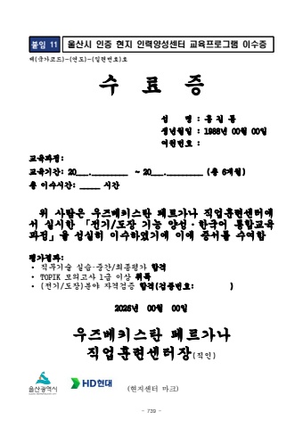 - 739 %uc81c(%uad6d%uac00%ucf54%ub4dc)-(%uc5f0%ub3c4)-(%uc77c%ub828%ubc88%ud638)%ud638%uc218 %ub8cc %uc99d%uc131 %uba85 : %ud64d %uae38 %ub3d9%uc0dd%ub144%uc6d4%uc77c : 1988%ub144 00%uc6d4 00%uc77c%uc5ec%uad8c%ubc88%ud638 : %uad50%uc721%uacfc%uc815: %uad50%uc721%uae30%uac04: 20___._________ ~ 20___._________ (%ucd1d 6%uac1c%uc6d4)%ucd1d %uc774%uc218%uc2dc%uac04: _____ %uc2dc%uac04%uc704 %uc0ac%ub78c%uc740 %uc6b0%uc988%ubca0%ud0a4%uc2a4%ud0c4 %ud398%ub974%uac00%ub098 %uc9c1%uc5c5%ud6c8%ub828%uc13c%ud130%uc5d0%uc11c %uc2e4%uc2dc%ud55c %uc804%uae30/%ub3c4%uc7a5 %uae30%ub2a5 %uc591%uc131%u00b7%ud55c%uad6d%uc5b4 %ud1b5%ud569%uad50%uc721%uacfc%uc815%u300d%uc744 %uc131%uc2e4%ud788 %uc774%uc218%ud558%uc600%uae30%uc5d0 %uc774%uc5d0 %uc99d%uc11c%ub97c %uc218%uc5ec%ud568%ud3c9%uac00%uacb0%uacfc:%u00b7 %uc9c1%ubb34%uae30%uc220 %uc2e4%uc2b5%uc911%uac04/%ucd5c%uc885%ud3c9%uac00 %ud569%uaca9%u00b7 TOPIK %ubaa8%uc758%uace0%uc0ac 1%uae09 %uc774%uc0c1 %ucde8%ub4dd%u00b7 (%uc804%uae30/%ub3c4%uc7a5)%ubd84%uc57c %uc790%uaca9%uac80%uc99d %ud569%uaca9(%uac80%uc99d%ubc88%ud638: )2026%ub144 OO%uc6d4 OO%uc77c%uc6b0%uc988%ubca0%ud0a4%uc2a4%ud0c4 %ud398%ub974%uac00%ub098 %uc9c1%uc5c5%ud6c8%ub828%uc13c%ud130%uc7a5(%uc9c1%uc778) (%ud604%uc9c0%uc13c%ud130 %ub9c8%ud06c)%ubd99%uc784 11%uc6b8%uc0b0%uc2dc %uc778%uc99d %ud604%uc9c0 %uc778%ub825%uc591%uc131%uc13c%ud130 %uad50%uc721%ud504%ub85c%uadf8%ub7a8 %uc774%uc218%uc99d