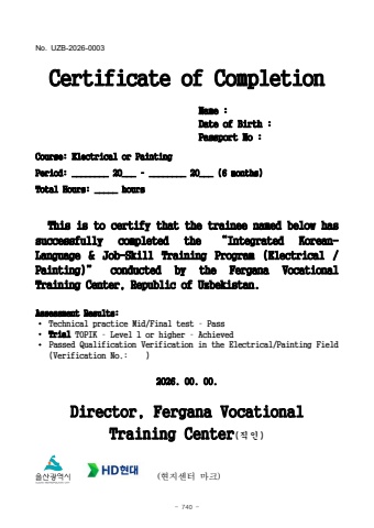 - 740 No. UZB-2026-0003Certificate of CompletionName : Date of Birth : Passport No : Course: Electrical or Painting Period: ________ 20___ %u2013 ________ 20___ (6 months)Total Hours: _____ hours This is to certify that the trainee named below has successfully completed the %u201cIntegrated KoreanLanguage & Job-Skill Training Program (Electrical / Painting)%u201d conducted by the Vocational Training Center, Republic of Uzbekistan.Assessment Results:%u00b7 Technical practice Mid/Final test %u2013 Pass%u00b7 Trial TOPIK %u2013 Level 1 or higher %u2013 Achieved%u00b7 Passed Qualification Verification in the Electrical/Painting Field(Verification No.:)2026. OO. OO.Director, Fergana Vocational Training Center(%uc9c1%uc778) (%ud604%uc9c0%uc13c%ud130 %ub9c8%ud06c)