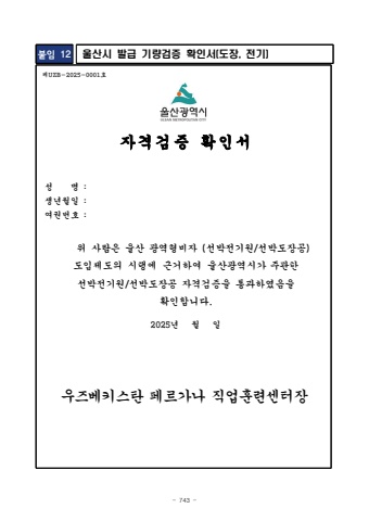 - 743 %uc81cUZB-2025-0001%ud638%uc6a9%uc811%ub4f1%uae09 : 6G%uac80%uc99d%uc77c%uc790 : %uc790%uaca9%uac80%uc99d %ud655%uc778%uc11c%uc131 %uba85 : %uc0dd%ub144%uc6d4%uc77c : %uc5ec%uad8c%ubc88%ud638 : %uc704 %uc0ac%ub78c%uc740 %uc6b8%uc0b0 %uad11%uc5ed%ud615%ube44%uc790 (%uc120%ubc15%uc804%uae30%uc6d0/%uc120%ubc15%ub3c4%uc7a5%uacf5)%ub3c4%uc785%uc81c%ub3c4%uc758 %uc2dc%ud589%uc5d0 %uadfc%uac70%ud558%uc5ec %uc6b8%uc0b0%uad11%uc5ed%uc2dc%uac00 %uc8fc%uad00%ud55c%uc120%ubc15%uc804%uae30%uc6d0/%uc120%ubc15%ub3c4%uc7a5%uacf5%uc790%uaca9%uac80%uc99d%uc744%ud1b5%uacfc%ud558%uc600%uc74c%uc744 %ud655%uc778%ud569%ub2c8%ub2e4.2025%ub144 %uc6d4 %uc77c%uc6b0%uc988%ubca0%ud0a4%uc2a4%ud0c4 %ud398%ub974%uac00%ub098 %uc9c1%uc5c5%ud6c8%ub828%uc13c%ud130%uc7a5%ubd99%uc784 12%uc6b8%uc0b0%uc2dc %ubc1c%uae09 %uae30%ub7c9%uac80%uc99d %ud655%uc778%uc11c(%ub3c4%uc7a5, %uc804%uae30)