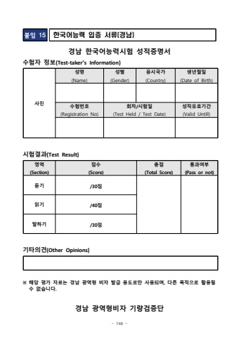 - 746 %uacbd%ub0a8 %ud55c%uad6d%uc5b4%ub2a5%ub825%uc2dc%ud5d8 %uc131%uc801%uc99d%uba85%uc11c %uc218%ud5d8%uc790 %uc815%ubcf4(Test-taker%u2019s Information)%uc2dc%ud5d8%uacb0%uacfc(Test Result)%uae30%ud0c0%uc758%uacac(Other Opinions)%u203b %ud574%ub2f9 %ud3c9%uac00 %uc790%ub8cc%ub294 %uacbd%ub0a8 %uad11%uc5ed%ud615 %ube44%uc790 %ubc1c%uae09 %uc6a9%ub3c4%ub85c%ub9cc %uc0ac%uc6a9%ub418%uba70, %ub2e4%ub978 %ubaa9%uc801%uc73c%ub85c %ud65c%uc6a9%ub420 %uc218 %uc5c6%uc2b5%ub2c8%ub2e4.%uacbd%ub0a8 %uad11%uc5ed%ud615%ube44%uc790 %uae30%ub7c9%uac80%uc99d%ub2e8%ubd99%uc784 15%ud55c%uad6d%uc5b4%ub2a5%ub825 %uc785%uc99d %uc11c%ub958(%uacbd%ub0a8)%uc0ac%uc9c4%uc131%uba85(Name)%uc131%ubcc4(Gender)%uc751%uc2dc%uad6d%uac00(Country)%uc0dd%ub144%uc6d4%uc77c(Date of Birth)%uc218%ud5d8%ubc88%ud638(Registration No)%ud68c%ucc28/%uc2dc%ud5d8%uc77c(Test Held / Test Date)%uc131%uc801%uc720%ud6a8%uae30%uac04(Valid Untill)%uc601%uc5ed(Section)%uc810%uc218(Score)%ucd1d%uc810(Total Score)%ud1b5%uacfc%uc5ec%ubd80(Pass or not)%ub4e3%uae30/30%uc810%uc77d%uae30/40%uc810%ub9d0%ud558%uae30/30%uc810