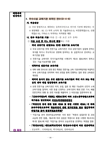 - 86 %uccb4%ub958%uc790%uaca9%ubcc0%uacbd%ud5c8%uac00%uf000%ubaa9%ucc284. %uc6b0%uc218%uc0ac%uc124 %uad50%uc721%uae30%uad00 %uc678%uad6d%uc778 %uc5f0%uc218(D-4-6)%uac00. %ud5c8%uc6a9%ub300%uc0c1 %u274d %uad6d%ub0b4 %ud569%ubc95%uc801%uc73c%ub85c %uccb4%ub958%ud558%ub294 %ub4f1%ub85d%uc678%uad6d%uc778%uc73c%ub85c %uc5f0%uc218%uc0dd %uae30%uc900%uc5d0 %ud574%ub2f9%ud558%ub294 %uc790%u203b %ubcc0%uacbd%uc81c%ud55c : B2, C3 %uc790%uaca9 %uc18c%uc9c0%uc790 %ubc0f %uae30%uc220%uc5f0%uc218(D-3), %ube44%uc804%ubb38%ucde8%uc5c5(E-9), %uc120%uc6d0%ucde8%uc5c5(E-10), %uae30%ud0c0(G-1) %uc790%uaca9%uc790%ub294 %uc790%uaca9%ubcc0%uacbd %uc81c%ud55c%ub098. %uc5f0%uc218 %ud5c8%uc6a9%uae30%uad00 %uae30%uc900 (%ub2e4%uc74c %u2460~%u2465 %uc694%uac74 %ubaa8%ub450 %ucda9%uc871) %u2460 %ub2e4%uc74c %uc694%uac74 %uc911 %uc5b4%ub290 %ud558%ub098%uc5d0 %ud574%ub2f9%ud558%ub294 %uae30%uad00%u00b7 %uad6d%ub0b4 %uc0c1%uc7a5%uae30%uc5c5 %uc124%ub9bd(%ub610%ub294 %uc5f0%uacc4) %uc804%ubb38%uae30%uc220 %uad50%uc721%uae30%uad00%u203b %uad6d%ub0b4 %uc0c1%uc7a5%uae30%uc5c5 %uc5f0%uacc4 %uc804%ubb38%uae30%uc220 %uad50%uc721%uae30%uad00%uc740 %uad6d%ub0b4 %uc0c1%uc7a5%uae30%uc5c5%uc774 %uc124%ub9bd%uc5d0 %uc900%ud558%ub294%ud22c%uc790%ub97c %ud558%uac70%ub098 %uc8fc%ub3c4%uc801%uc73c%ub85c %uacbd%uc601%uc5d0 %ucc38%uc5ec%ud558%ub294 %ub4f1 %uc2e4%uc9c8%uc801%uc73c%ub85c %uad00%ub9ac%ud558%ub294 %uad50%uc721%uae30%uad00%uc744 %ub9d0%ud568%u203b %uc804%ubb38%uae30%uc220 %uad50%uc721%uc774%ub780 %uad6d%uac00%uae30%uc220%uc790%uaca9%ubc95 %uc2dc%ud589%uaddc%uce59 %uc81c3%uc870 %ubcc4%ud45c2%uc5d0%uc11c %uc815%ud558%uace0 %uc788%ub294 %uae30%uc220%u00b7%uae30%ub2a5%ubd84%uc57c%ub97c %ub9d0%ud568%u00b7 %ub300%ud559%ubd80%uc124 %uc804%ubb38%uae30%uc220 %uad50%uc721%uae30%uad00 %u203b %ub300%ud559 %ub0b4%uc5d0 %uc815%uc2dd%uc73c%ub85c %uc6b4%uc601 %uc911%uc778 %ud2b9%ud654%ub41c %uc804%ubb38%uae30%uc220 %uad50%uc721 %uae30%uad00(%uc5b4%ud559%ub2f9%ucc98%ub7fc %ub3c5%ub9bd%uc801%uc778%ubd80%uc18d %uad50%uc721%uae30%uad00)%uc744 %uc758%ubbf8%ud558%uba70 %uc5ec%ub7ec %uacfc%uc815%uc744 %ud568%uaed8 %uc9c4%ud589%ud558%ub294 %uc77c%ubc18 %ud3c9%uc0dd %uad50%uc721%uc6d0%uc740%uc81c%uc678%ub428 %u00b7 %ud574%uc678%uc5d0 %ubcf8%uc0ac%uac00 %uc788%ub294 %uc720%uba85 %uc804%ubb38%uae30%uc220 %uad50%uc721%uae30%uad00%uc758 %uad6d%ub0b4 %uc9c0%uc0ac %ub610%ub294 %ub3c5%uc810 %uc6b4%uc601 %uacc4%uc57d %uccb4%uacb0 %ubc95%uc778%ud615%ud0dc%uc758 %uad50%uc721%uae30%uad00 %u203b %uc720%uba85 %uc804%ubb38%uae30%uc220 %uad50%uc721%uae30%uad00%uc740 %ubbf8%uad6d, %uc720%ub7fd, %uc77c%ubcf8 %ub4f1 %ud574%ub2f9 %uae30%ub2a5%ubd84%uc57c %uc120%uc9c4%uad6d %uc18c%uc7ac %uad50%uc721%uae30%uad00%uc744 %ub9d0%ud558%uba70, %uc0ac%uc99d %ub4f1%uc744 %uc2e0%uccad%ud558%ub294 %uad50%uc721%uae30%uad00%uc774 %ud574%uc678 %uc5b8%ub860 %uae30%uc0ac, %ubc30%ucd9c %uc804%ubb38%uc778%ub825%uc758 %ud604%ud669 %ub4f1 %uad00%ub828 %uc790%ub8cc%ub97c %uc81c%ucd9c%ud558%uc5ec %uadf8 %ud0c0%ub2f9%uc131%uc744 %uc785%uc99d%ud558%uc5ec%uc57c %ud568%u00b7%u300c%uadfc%ub85c%uc790%uc9c1%uc5c5%ub2a5%ub825 %uac1c%ubc1c%ubc95%u300d%uc81c32%uc8701%ud56d%uc5d0 %ub530%ub77c %uace0%uc6a9%ub178%ub3d9%ubd80%uc7a5%uad00%uc73c%ub85c%ubd80%ud130 %ud5c8%uac00%ubc1b%uc740 %ubc95%uc778%ud615%ud0dc%uc758 %uc9c1%uc5c5%ub2a5%ub825%uac1c%ubc1c%ud6c8%ub828%ubc95%uc778 %u00b7%u300c%ud559%uc810%uc778%uc815 %ub4f1%uc5d0 %uad00%ud55c %ubc95%ub960 %uc81c3%uc870 %ubc0f %ub3d9%ubc95 %uc2dc%ud589%ub839 %uc81c3%uc870%u300d%uc5d0 %ub530%ub77c %uad50%uc721%ubd80%uc7a5%uad00%uc73c%ub85c%ubd80%ud130 %ud559%uc2b5%uacfc%uc815%uc5d0 %ub300%ud574 %ud3c9%uac00%uc778%uc815%uc744 %ubc1b%uc740 %ubc95%uc778%ud615%ud0dc%uc758 %uc9c1%uc5c5%uae30%uc220 %ubd84%uc57c %ud3c9%uc0dd%uc9c1%uc5c5%uad50%uc721%ud559%uc6d0** %u2018%uc9c1%uc5c5%uae30%uc220 %ubd84%uc57c %ud3c9%uc0dd%uc9c1%uc5c5%uad50%uc721%ud559%uc6d0%u2019 %uc774%ub77c %ud568%uc740 %u300c%ud559%uc6d0%uc758 %uc124%ub9bd%uc6b4%uc601 %ubc0f %uacfc%uc678%uad50%uc2b5%uc5d0 %uad00%ud55c %ubc95%ub960%u300d %uc81c6%uc870%uc5d0 %ub530%ub77c %uc124%ub9bd%ub41c %ud559%uc6d0%uc73c%ub85c %ub3d9%ubc95 %uc2dc%ud589%ub839 %uc81c3%uc870%uc7583 %uc81c1%ud56d %ubcc4%ud45c2%uc5d0 %ub530%ub978 %u2018%uc9c1%uc5c5%uae30%uc220 %ubd84%uc57c%uc758 %uad50%uc2b5%uacfc%uc815%u2019%uc744 %uc6b4%uc601%ud558%ub294 %ud559%uc6d0%uc744 %ub9d0%ud568 %u00b7%u300c%ud3c9%uc0dd%uad50%uc721%ubc95%u300d%uc81c31%uc870(%ud559%uad50%ud615%ud0dc%uc758 %ud3c9%uc0dd%uad50%uc721%uc2dc%uc124)%uc5d0 %ub530%ub978 %uc804%uacf5%ub300%ud559%uad50 -%uc804%uacf5%ub300%ud559 :%uad6d%uc81c%uc608%uc220%ub300,%ubc31%uc11d%uc608%uc220%ub300,%uc815%ud654%uc608%uc220%ub300
