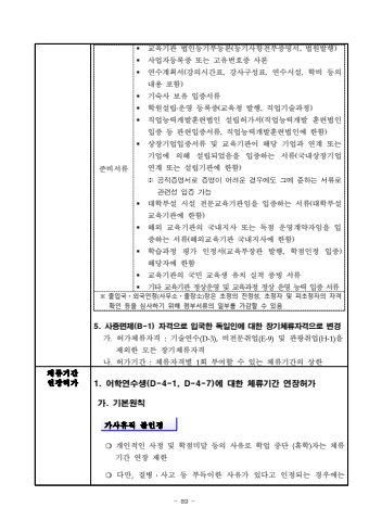 - 89 5. %uc0ac%uc99d%uba74%uc81c(B-1) %uc790%uaca9%uc73c%ub85c %uc785%uad6d%ud55c %ub3c5%uc77c%uc778%uc5d0 %ub300%ud55c %uc7a5%uae30%uccb4%ub958%uc790%uaca9%uc73c%ub85c %ubcc0%uacbd%uac00.%ud5c8%uac00%uccb4%ub958%uc790%uaca9 :%uae30%uc220%uc5f0%uc218(D-3),%ube44%uc804%ubb38%ucde8%uc5c5(E-9)%ubc0f %uad00%uad11%ucde8%uc5c5(H-1)%uc744%uc81c%uc678%ud55c %ubaa8%ub4e0 %uc7a5%uae30%uccb4%ub958%uc790%uaca9%ub098.%ud5c8%uac00%uae30%uac04 :%uccb4%ub958%uc790%uaca9%ubcc4 1%ud68c %ubd80%uc5ec%ud560 %uc218 %uc788%ub294 %uccb4%ub958%uae30%uac04%uc758 %uc0c1%ud55c%uc900%ube44%uc11c%ub958%u00a7%uad50%uc721%uae30%uad00 %ubc95%uc778%ub4f1%uae30%ubd80%ub4f1%ubcf8(%ub4f1%uae30%uc0ac%ud56d%uc804%ubd80%uc99d%uba85%uc11c, %ubc95%uc6d0%ubc1c%ud589)%u00a7%uc0ac%uc5c5%uc790%ub4f1%ub85d%uc99d %ub610%ub294 %uace0%uc720%ubc88%ud638%uc99d %uc0ac%ubcf8%u00a7%uc5f0%uc218%uacc4%ud68d%uc11c(%uac15%uc758%uc2dc%uac04%ud45c, %uac15%uc0ac%uad6c%uc131%ud45c, %uc5f0%uc218%uc2dc%uc124, %ud559%ube44 %ub4f1%uc758 %ub0b4%uc6a9 %ud3ec%ud568)%u00a7%uae30%uc219%uc0ac %ubcf4%uc720 %uc785%uc99d%uc11c%ub958%u00a7%ud559%uc6d0%uc124%ub9bd%u2024%uc6b4%uc601 %ub4f1%ub85d%uc99d(%uad50%uc721%uccad %ubc1c%ud589, %uc9c1%uc5c5%uae30%uc220%uacfc%uc815)%u00a7%uc9c1%uc5c5%ub2a5%ub825%uac1c%ubc1c%ud6c8%ub828%ubc95%uc778 %uc124%ub9bd%ud5c8%uac00%uc11c(%uc9c1%uc5c5%ub2a5%ub825%uac1c%ubc1c %ud6c8%ub828%ubc95%uc778 %uc785%uc99d %ub4f1 %uad00%ub828%uc785%uc99d%uc11c%ub958, %uc9c1%uc5c5%ub2a5%ub825%uac1c%ubc1c%ud6c8%ub828%ubc95%uc778%uc5d0 %ud55c%ud568)%u00a7%uc0c1%uc7a5%uae30%uc5c5%uc785%uc99d%uc11c%ub958 %ubc0f %uad50%uc721%uae30%uad00%uc774 %ud574%ub2f9 %uae30%uc5c5%uacfc %uc5f0%uacc4 %ub610%ub294 %uae30%uc5c5%uc5d0 %uc758%ud574 %uc124%ub9bd%ub418%uc5c8%uc74c%uc744 %uc785%uc99d%ud558%ub294 %uc11c%ub958(%uad6d%ub0b4%uc0c1%uc7a5%uae30%uc5c5 %uc5f0%uacc4 %ub610%ub294 %uc124%ub9bd%uae30%uad00%uc5d0 %ud55c%ud568)%u203b%uacf5%uc801%uc99d%uba85%uc11c%ub85c%uc99d%uba85%uc774%uc5b4%ub824%uc6b4%uacbd%uc6b0%uc5d0%ub3c4%uadf8%uc5d0%uc900%ud558%ub294%uc11c%ub958%ub85c%uad00%ub828%uc131%uc785%uc99d%uac00%ub2a5%u00a7%ub300%ud559%ubd80%uc124 %uc2dc%uc124 %uc804%ubb38%uad50%uc721%uae30%uad00%uc784%uc744 %uc785%uc99d%ud558%ub294 %uc11c%ub958(%ub300%ud559%ubd80%uc124 %uad50%uc721%uae30%uad00%uc5d0 %ud55c%ud568)%u00a7%ud574%uc678 %uad50%uc721%uae30%uad00%uc758 %uad6d%ub0b4%uc9c0%uc0ac %ub610%ub294 %ub3c5%uc810 %uc6b4%uc601%uacc4%uc57d%uc790%uc784%uc744 %uc785%uc99d%ud558%ub294 %uc11c%ub958(%ud574%uc678%uad50%uc721%uae30%uad00 %uad6d%ub0b4%uc9c0%uc0ac%uc5d0 %ud55c%ud568) %u00a7%ud559%uc2b5%uacfc%uc815 %ud3c9%uac00 %uc778%uc815%uc11c(%uad50%uc721%ubd80%uc7a5%uad00 %ubc1c%ud589, %ud559%uc810%uc778%uc815 %uc785%uc99d) %ud574%ub2f9%uc790%uc5d0 %ud55c%ud568%u00a7%uad50%uc721%uae30%uad00%uc758 %uad6d%ubbfc %uad50%uc721%uc0dd %uc720%uce58 %uc2e4%uc801%uc99d%ube59 %uc11c%ub958%u00a7%uae30%ud0c0 %uad50%uc721%uae30%uad00 %uc815%uc0c1%uc6b4%uc601 %ubc0f %uad50%uc721%uacfc%uc815 %uc815%uc0c1 %uc6b4%uc601 %ub2a5%ub825 %uc785%uc99d %uc11c%ub958%u203b %ucd9c%uc785%uad6d%u318d%uc678%uad6d%uc778%uccad(%uc0ac%ubb34%uc18c%u318d%ucd9c%uc7a5%uc18c)%uc7a5%uc740 %ucd08%uccad%uc758 %uc9c4%uc815%uc131, %ucd08%uccad%uc790 %ubc0f %ud53c%ucd08%uccad%uc790%uc758 %uc790%uaca9%ud655%uc778 %ub4f1%uc744 %uc2ec%uc0ac%ud558%uae30 %uc704%ud574 %ucca8%ubd80%uc11c%ub958%uc758 %uc77c%ubd80%ub97c %uac00%uac10%ud560 %uc218 %uc788%uc74c%uc5f0%uc7a5%ud5c8%uac001. %uc5b4%ud559%uc5f0%uc218%uc0dd(D-4-1, D-4-7)%uc5d0 %ub300%ud55c %uccb4%ub958%uae30%uac04 %uc5f0%uc7a5%ud5c8%uac00%uac00. %uae30%ubcf8%uc6d0%uce59 %uac00%uc0ac%ud734%uc9c1 %ubd88%uc778%uc815%u274d%uac1c%uc778%uc801%uc778 %uc0ac%uc815 %ubc0f %ud559%uc810%ubbf8%ub2ec %ub4f1%uc758 %uc0ac%uc720%ub85c %ud559%uc5c5 %uc911%ub2e8 (%ud734%ud559)%uc790%ub294 %uccb4%ub958%uae30%uac04 %uc5f0%uc7a5 %uc81c%ud55c %u274d%ub2e4%ub9cc,%uc9c8%ubcd1%u2024%uc0ac%uace0 %ub4f1 %ubd80%ub4dd%uc774%ud55c %uc0ac%uc720%uac00 %uc788%ub2e4%uace0 %uc778%uc815%ub418%ub294 %uacbd%uc6b0%uc5d0%ub294