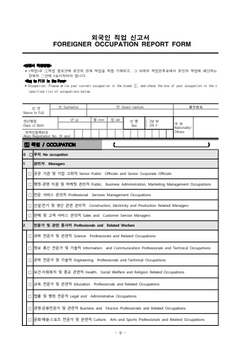 - 9 %uc678%uad6d%uc778%uc9c1%uc5c5%uc2e0%uace0%uc11cFOREIGNEROCCUPATIONREPORTFORM<%uc2e0%uccad%uc11c %uc791%uc131%ubc29%ubc95>%u2023 <%uc9c1%uc5c5>%uc740 %uf000%uc9c1%uc5c5 %uad04%ud638%uc548%uc5d0 %ubcf8%uc778%uc758 %ud604%uc7ac %uc9c1%uc5c5%uc744 %uc9c1%uc811 %uae30%uc7ac%ud558%uace0, %uadf8 %uc544%ub798%uc758 %uc9c1%uc5c5%ubd84%ub958%ud45c%uc5d0%uc11c %ubcf8%uc778%uc758 %uc9c1%uc5c5%uc5d0 %ud574%ub2f9%ud558%ub294 %ud56d%ubaa9%uc758 %u25a1%uc548%uc5d0 V%ud45c%uc2dc%ud558%uc5ec%uc57c %ud569%ub2c8%ub2e4%u2023 Occupation: Please write your current occupation in the blank %uf000, and check the box of your occupation in theclassified list of occupations below.%uc131 %uba85Name In Full%uc131 Surname%uba85 Given names%u6f22%u5b57%u59d3%u540d%uc0dd%ub144%uc6d4%uc77c Date of Birth%ub144 yy%uc6d4 mm%uc77c dd%uc131 %ubcc4 Sex[ ]%ub0a8 M[ ]%uc5ec F%uad6d %uc801Nationality/Others%uc678%uad6d%uc778%ub4f1%ub85d%ubc88%ud638Alien Registration No. (If any)%uf000 %uc9c1%uc5c5 / OCCUPATION ( )0 %u25a1%ubb34%uc9c1 No occupation1%uad00%ub9ac%uc790 Managers%u25a1%uacf5%uacf5 %uae30%uad00 %ubc0f %uae30%uc5c5 %uace0%uc704%uc9c1 Senior Public Officials and Senior Corporate Officials%u25a1%ud589%uc815%u2219%uacbd%uc601 %uc9c0%uc6d0 %ubc0f %ub9c8%ucf00%ud305 %uad00%ub9ac%uc9c1 Public, Business Administration, Marketing Management Occupations%u25a1%uc804%ubb38 %uc11c%ube44%uc2a4 %uad00%ub9ac%uc9c1 Professional Services Management Occupations%u25a1%uac74%uc124%u00b7%uc804%uae30 %ubc0f %uc0dd%uc0b0 %uad00%ub828 %uad00%ub9ac%uc9c1 Construction, Electricity and Production Related Managers%u25a1%ud310%ub9e4 %ubc0f %uace0%uac1d %uc11c%ube44%uc2a4 %uad00%ub9ac%uc9c1 Sales and Customer Service Managers2%uc804%ubb38%uac00 %ubc0f %uad00%ub828 %uc885%uc0ac%uc790 Professionals and Related Workers%u25a1%uacfc%ud559 %uc804%ubb38%uac00 %ubc0f %uad00%ub828%uc9c1 Science Professionals and Related Occupations%u25a1%uc815%ubcf4 %ud1b5%uc2e0 %uc804%ubb38%uac00 %ubc0f %uae30%uc220%uc9c1 Information and Communication Professionals and Technical Occupations%u25a1%uacf5%ud559 %uc804%ubb38%uac00 %ubc0f %uae30%uc220%uc9c1 Engineering Professionals and Technical Occupations%u25a1%ubcf4%uac74%u00b7%uc0ac%ud68c%ubcf5%uc9c0 %ubc0f %uc885%uad50 %uad00%ub828%uc9c1 Health, Social Welfare and Religion Related Occupations%u25a1%uad50%uc721 %uc804%ubb38%uac00 %ubc0f %uad00%ub828%uc9c1 Education Professionals and Related Occupations%u25a1%ubc95%ub960 %ubc0f %ud589%uc815 %uc804%ubb38%uc9c1 Legal and Administrative Occupations%u25a1%uacbd%uc601%u00b7%uae08%uc735%uc804%ubb38%uac00 %ubc0f %uad00%ub828%uc9c1 Business and Finance Professionals and Related Occupations%u25a1%ubb38%ud654%u00b7%uc608%uc220%u00b7%uc2a4%ud3ec%uce20 %uc804%ubb38%uac00 %ubc0f %uad00%ub828%uc9c1 Culture, Arts and Sports Professionals and Related Occupations