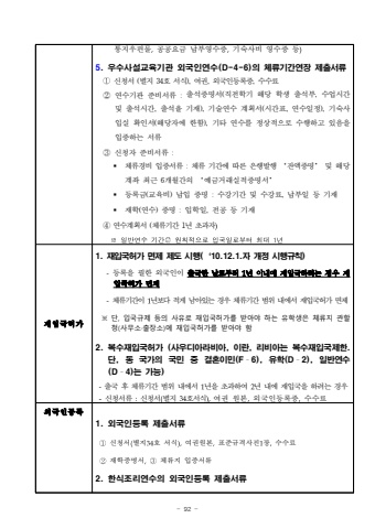 - 92 %ud1b5%uc9c0%uc6b0%ud3b8%ubb3c,%uacf5%uacf5%uc694%uae08 %ub0a9%ubd80%uc601%uc218%uc99d,%uae30%uc219%uc0ac%ube44 %uc601%uc218%uc99d %ub4f1)5. %uc6b0%uc218%uc0ac%uc124%uad50%uc721%uae30%uad00 %uc678%uad6d%uc778%uc5f0%uc218(D-4-6)%uc758 %uccb4%ub958%uae30%uac04%uc5f0%uc7a5 %uc81c%ucd9c%uc11c%ub958%u2460%uc2e0%uccad%uc11c (%ubcc4%uc9c0 34%ud638 %uc11c%uc2dd), %uc5ec%uad8c, %uc678%uad6d%uc778%ub4f1%ub85d%uc99d, %uc218%uc218%ub8cc %u2461 %uc5f0%uc218%uae30%uad00 %uc900%ube44%uc11c%ub958 : %ucd9c%uc11d%uc99d%uba85%uc11c(%uc9c1%uc804%ud559%uae30 %ud574%ub2f9 %ud559%uc0dd %ucd9c%uc11d%ubd80, %uc218%uc5c5%uc2dc%uac04 %ubc0f %ucd9c%uc11d%uc2dc%uac04, %ucd9c%uc11d%uc728 %uae30%uc7ac), %uae30%uc220%uc5f0%uc218 %uacc4%ud68d%uc11c(%uc2dc%uac04%ud45c, %uc5f0%uc218%uc77c%uc815), %uae30%uc219%uc0ac %uc785%uc2e4 %ud655%uc778%uc11c(%ud574%ub2f9%uc790%uc5d0 %ud55c%ud568), %uae30%ud0c0 %uc5f0%uc218%ub97c %uc815%uc0c1%uc801%uc73c%ub85c %uc218%ud589%ud558%uace0 %uc788%uc74c%uc744 %uc785%uc99d%ud558%ub294 %uc11c%ub958%u2462 %uc2e0%uccad%uc790 %uc900%ube44%uc11c%ub958 : %u00a7%uccb4%ub958%uacbd%ube44 %uc785%uc99d%uc11c%ub958 : %uccb4%ub958 %uae30%uac04%uc5d0 %ub530%ub978 %uc740%ud589%ubc1c%ud589 %u2018%uc794%uc561%uc99d%uba85%u2019 %ubc0f %ud574%ub2f9 %uacc4%uc88c %ucd5c%uadfc 6%uac1c%uc6d4%uac04%uc758 %u2018%uc608%uae08%uac70%ub798%uc2e4%uc801%uc99d%uba85%uc11c%u2019%u00a7%ub4f1%ub85d%uae08(%uad50%uc721%ube44) %ub0a9%uc785 %uc99d%uba85 : %uc218%uac15%uae30%uac04 %ubc0f %uc218%uac15%ub8cc, %ub0a9%ubd80%uc77c %ub4f1 %uae30%uc7ac%u00a7%uc7ac%ud559(%uc5f0%uc218) %uc99d%uba85 : %uc785%ud559%uc77c, %uc804%uacf5 %ub4f1 %uae30%uc7ac%u2463 %uc5f0%uc218%uacc4%ud68d%uc11c (%uccb4%ub958%uae30%uac04 1%ub144 %ucd08%uacfc%uc790)%u203b%uc77c%ubc18%uc5f0%uc218%uae30%uac04%uc740%uc6d0%uce59%uc801%uc73c%ub85c%uc785%uad6d%uc77c%ub85c%ubd80%ud130%ucd5c%ub3001%ub144%uc7ac%uc785%uad6d%ud5c8%uac001. %uc7ac%uc785%uad6d%ud5c8%uac00 %uba74%uc81c %uc81c%ub3c4 %uc2dc%ud589(%u201810.12.1.%uc790 %uac1c%uc815 %uc2dc%ud589%uaddc%uce59)%ub4f1%ub85d%uc744 %ud544%ud55c %uc678%uad6d%uc778%uc774 %ucd9c%uad6d%ud55c %ub0a0%ub85c%ubd80%ud130 %ub144 %uc774%ub0b4%uc5d0 %uc7ac%uc785%uad6d%ud558%ub824%ub294%uacbd%uc6b0 %uc7ac%uc785%uad6d%ud5c8%uac00 %uba74%uc81c-%uccb4%ub958%uae30%uac04%uc774 1%ub144%ubcf4%ub2e4 %uc801%uac8c %ub0a8%uc544%uc788%ub294 %uacbd%uc6b0 %uccb4%ub958%uae30%uac04 %ubc94%uc704 %ub0b4%uc5d0%uc11c %uc7ac%uc785%uad6d%ud5c8%uac00 %uba74%uc81c%u203b %ub2e8, %uc785%uad6d%uaddc%uc81c %ub4f1%uc758 %uc0ac%uc720%ub85c %uc7ac%uc785%uad6d%ud5c8%uac00%ub97c %ubc1b%uc544%uc57c %ud558%ub294 %uc720%ud559%uc0dd%uc740 %uccb4%ub958%uc9c0 %uad00%ud560%uccad(%uc0ac%ubb34%uc18c%u00b7%ucd9c%uc7a5%uc18c)%uc5d0 %uc7ac%uc785%uad6d%ud5c8%uac00%ub97c %ubc1b%uc544%uc57c %ud5682. %ubcf5%uc218%uc7ac%uc785%uad6d%ud5c8%uac00 (%uc0ac%uc6b0%ub514%uc544%ub77c%ube44%uc544, %uc774%ub780, %ub9ac%ube44%uc544%ub294 %ubcf5%uc218%uc7ac%uc785%uad6d%uc81c%ud55c.%ub2e8, %ub3d9 %uad6d%uac00%uc758 %uad6d%ubbfc %uc911 %uacb0%ud63c%uc774%ubbfc(F%u00ad6), %uc720%ud559(D%u00ad2), %uc77c%ubc18%uc5f0%uc218(D%u00ad4)%ub294%uac00%ub2a5)-%ucd9c%uad6d %ud6c4 %uccb4%ub958%uae30%uac04 %ubc94%uc704 %ub0b4%uc5d0%uc11c 1%ub144%uc744 %ucd08%uacfc%ud558%uc5ec 2%ub144 %ub0b4%uc5d0 %uc7ac%uc785%uad6d%uc744 %ud558%ub824%ub294 %uacbd%uc6b0-%uc2e0%uccad%uc11c%ub958 :%uc2e0%uccad%uc11c(%ubcc4%uc9c0 34%ud638%uc11c%uc2dd),%uc5ec%uad8c %uc6d0%ubcf8,%uc678%uad6d%uc778%ub4f1%ub85d%uc99d,%uc218%uc218%ub8cc%uc678%uad6d%uc778%ub4f1%ub85d1. %uc678%uad6d%uc778%ub4f1%ub85d %uc81c%ucd9c%uc11c%ub958%u2460%uc2e0%uccad%uc11c(%ubcc4%uc9c034%ud638 %uc11c%uc2dd),%uc5ec%uad8c%uc6d0%ubcf8,%ud45c%uc900%uaddc%uaca9%uc0ac%uc9c41%uc7a5,%uc218%uc218%ub8cc %u2461%uc7ac%ud559%uc99d%uba85%uc11c,%u2462%uccb4%ub958%uc9c0 %uc785%uc99d%uc11c%ub9582. %ud55c%uc2dd%uc870%ub9ac%uc5f0%uc218%uc758 %uc678%uad6d%uc778%ub4f1%ub85d %uc81c%ucd9c%uc11c%ub958