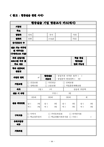- 96 < %ucc38%uace0 : %ud604%uc7a5%uc2e4%uc2b5 %uad00%ub828 %uc11c%uc2dd>%ud604%uc7a5%uc2e4%uc2b5 %uae30%uc5c5 %ubc29%ubb38%uc870%uc0ac %uce74%ub4dc(%uc608%uc2dc)%uae30%uc5c5%uba85%uc8fc%uc18c%ub2f4%ub2f9%uc790%uc131%uba85%ubd80%uc11c%uc9c1%uc704%uc5f0%ub77d%ucc98%uc804%ud654e-mailFAX%uc0c1%uc2dc%uadfc%ub85c%uc790 %uc218%uc2e4%uc2b5 %uac00%ub2a5 %uc9c1%ubb34%uba85 %ubc0f %uc9c1%ubb34%ub0b4%uc6a9(%uad6c%uccb4%uc801%uc73c%ub85c %uae30%uc220)%uc790%uccb4 %uc2e0%uc785%uc0ac%uc6d0 %ud504%ub85c%uadf8%ub7a8 %uc5ec%ubd80 %ubc0f %uc8fc%uc694 %ub0b4%uc6a9%ud559%uc2b5 %uc911%uc2ec %ud604%uc7a5%uc2e4%uc2b5%uc5f0%uacc4 %uac00%ub2a5%uc131%ud559%uacfc %uc804%uacf5%uacfc%uc758 %uad00%ub828%uc131%uc0ac%uc5c5%uc7a5 %uba74%uc801%u33a1%ud604%uc7a5%uc2e4%uc2b5 %uc9c0%ub3c4%uc790- %ub3d9%uc77c%uc9c1%uc885 %uc790%uaca9%uc99d %uc720/%ubb34 ( )- %ub3d9%uc77c%ubd84%uc57c %ud604%uc7a5%uacbd%ub825 ( )%ub144 %uac00%uc785%ubcf4%ud5d8%u25a1 %uac74%uac15%ubcf4%ud5d8 %u25a1 %uad6d%ubbfc%uc5f0%uae08 %u25a1 %uc0b0%uc7ac%ubcf4%ud5d8%u25a1 %uc0c1%ud574%ubcf4%ud5d8 %u25a1 %uace0%uc6a9%ubcf4%ud5d8 %u25a1 %uc9c1%uc5c5%ud6c8%ub828%uc7ac%ud574%ubcf4%ud5d8%uc2dd%uc0ac1%uc77c ( )%uc2dd%uc2e4%uc2b5%uc0dd %ubd80%ub2f4%uc561:%uc2e4%uc2b5 %uc2dc %uc218%ub2f9%uc218%ub2f9 ( )%uc6d0%uc2e4%uc2b5 %ud76c%ub9dd%uc778%uc6d0OO%uacfcOO%uacfcOO%uacfc%uacc4%ub0a8 ( )%uba85%uc5ec ( )%uba85%ub0a8 ( )%uba85%uc5ec ( )%uba85%ub0a8 ( )%uba85%uc5ec ( )%uba85%ub0a8 ( )%uba85%uc5ec ( )%uba85%uad6c%ube44%uc11c%ub958 %u25a1 %uc774%ub825%uc11c %u25a1 %uc8fc%ubbfc%ub4f1%ub85d%ub4f1%ubcf8 %u25a1 %uc790%uaca9%uc99d%uc0ac%ubcf8%u25a1 %ud559%uad50%uc7a5%ucd94%ucc9c%uc11c %u25a1 %ud559%uad50%uc0dd%ud65c%uae30%ub85d%ubd80%uc0ac%ubcf8 %u25a1 %uae30%ud0c0 ( )%uc720%ud574%uc0ac%uc5c5%uc7a5%uc5ec%ubd80%uae30%ud0c0%uc758%uacac