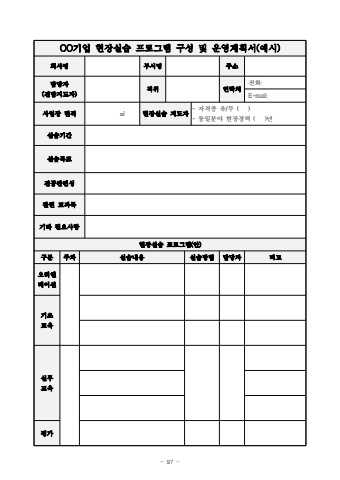 - 97 OO%uae30%uc5c5 %ud604%uc7a5%uc2e4%uc2b5 %ud504%ub85c%uadf8%ub7a8 %uad6c%uc131 %ubc0f %uc6b4%uc601%uacc4%ud68d%uc11c(%uc608%uc2dc)%ud68c%uc0ac%uba85%ubd80%uc11c%uba85%uc8fc%uc18c%ub2f4%ub2f9%uc790(%uc804%ub2f4%uc9c0%ub3c4%uc790)%uc9c1%uc704%uc5f0%ub77d%ucc98%uc804%ud654:E-mail:%uc0ac%uc5c5%uc7a5 %uba74%uc801%u33a1%ud604%uc7a5%uc2e4%uc2b5 %uc9c0%ub3c4%uc790- %uc790%uaca9%uc99d %uc720/%ubb34 ( )- %ub3d9%uc77c%ubd84%uc57c %ud604%uc7a5%uacbd%ub825 ( )%ub144 %uc2e4%uc2b5%uae30%uac04%uc2e4%uc2b5%ubaa9%ud45c%uc804%uacf5%uad00%ub828%uc131%uad00%ub828 %uad50%uacfc%ubaa9%uae30%ud0c0 %ud544%uc694%uc0ac%ud56d%ud604%uc7a5%uc2e4%uc2b5 %ud504%ub85c%uadf8%ub7a8(%uc548)%uad6c%ubd84%uc8fc%ucc28%uc2e4%uc2b5%ub0b4%uc6a9%uc2e4%uc2b5%ubc29%ubc95%ub2f4%ub2f9%uc790%ube44%uace0%uc624%ub9ac%uc5d4%ud14c%uc774%uc158%uae30%ucd08%uad50%uc721%uc2e4%ubb34%uad50%uc721%ud3c9%uac00